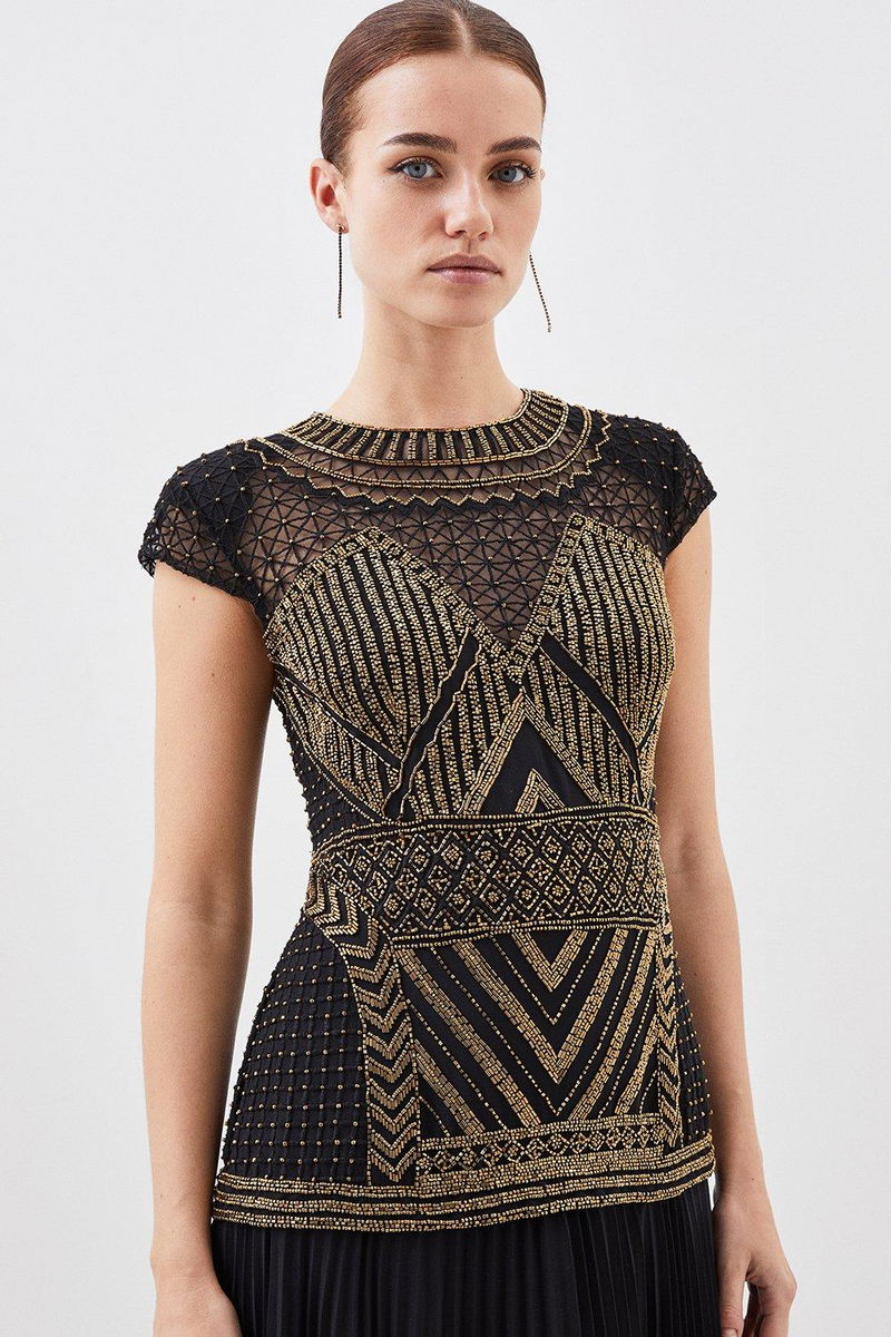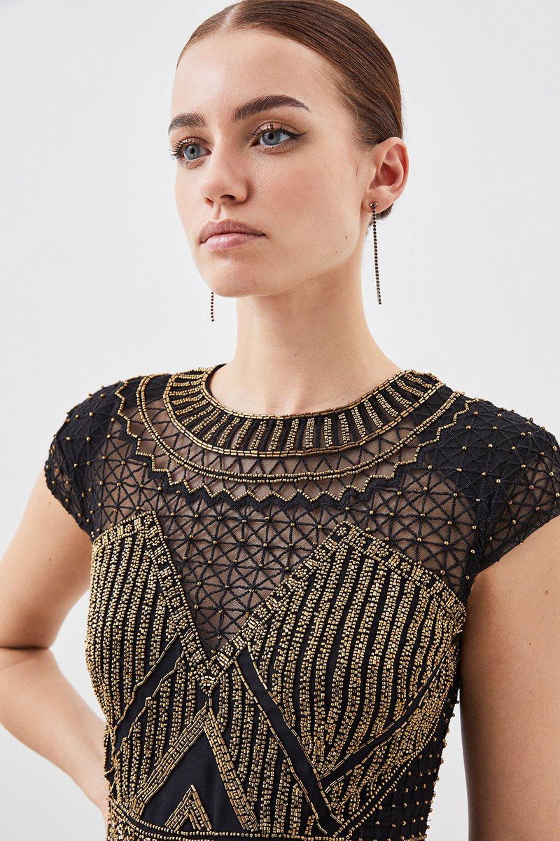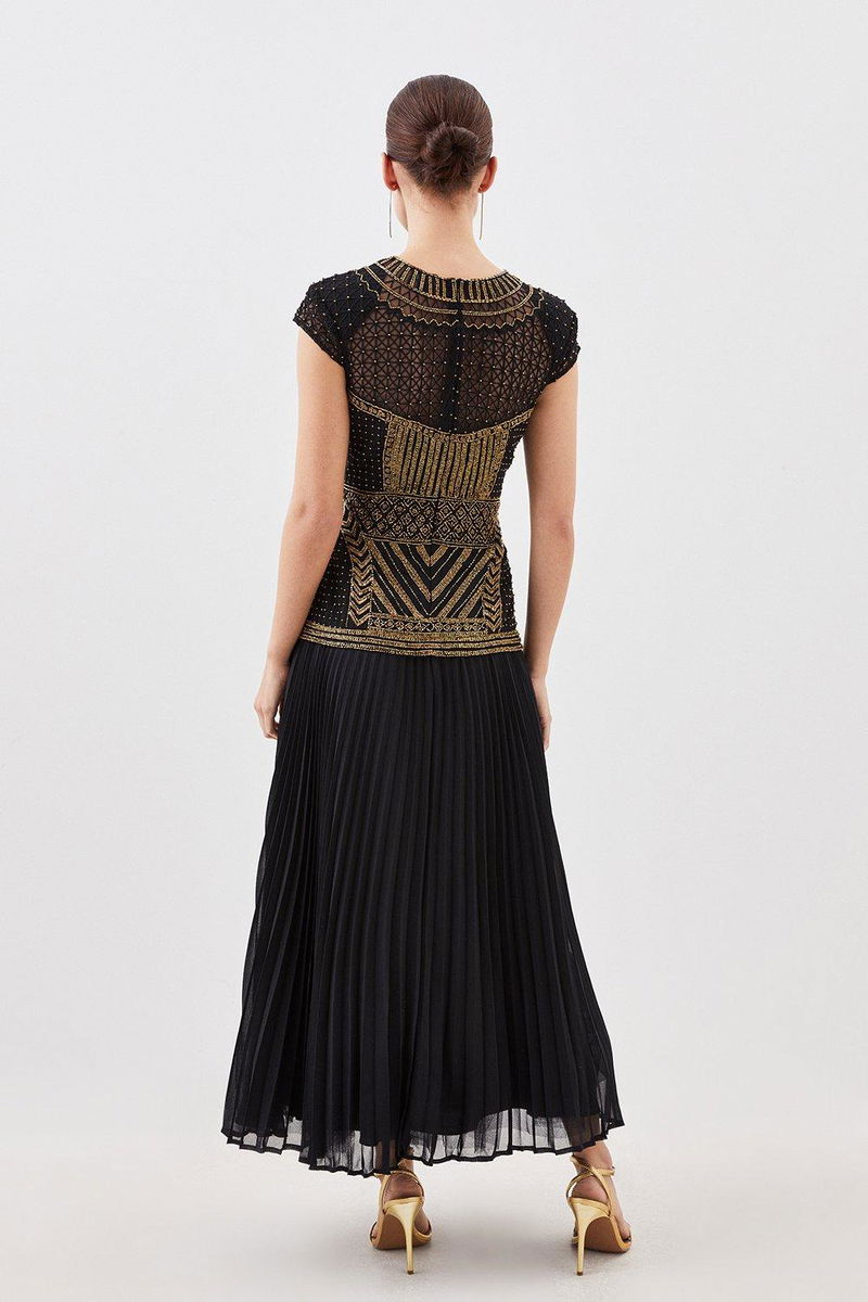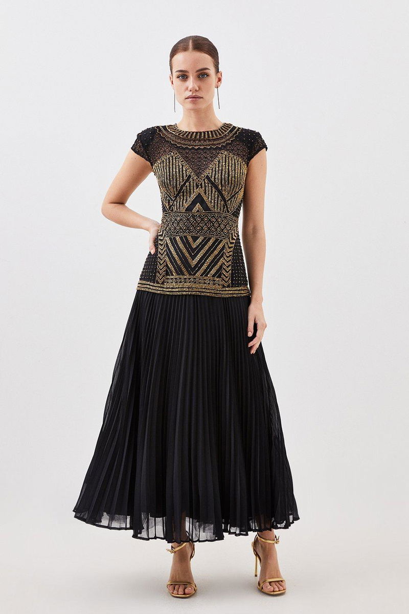 Intricate detailing adorns this piece for elevated occasionwear. The bodice entails a round neck, short sleeves and contrasting artful print, cut by a flowing pleated skirt that falls to a maxi hemline. Pair with golden accessories and barely-there heels for sophisticated occasionwear.