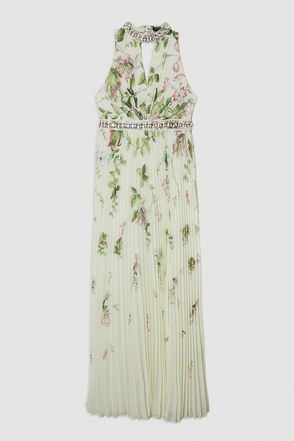 Petite Scattered Floral Balloon Sleeve Pleated Crinkle Cut Out Woven Maxi Dress