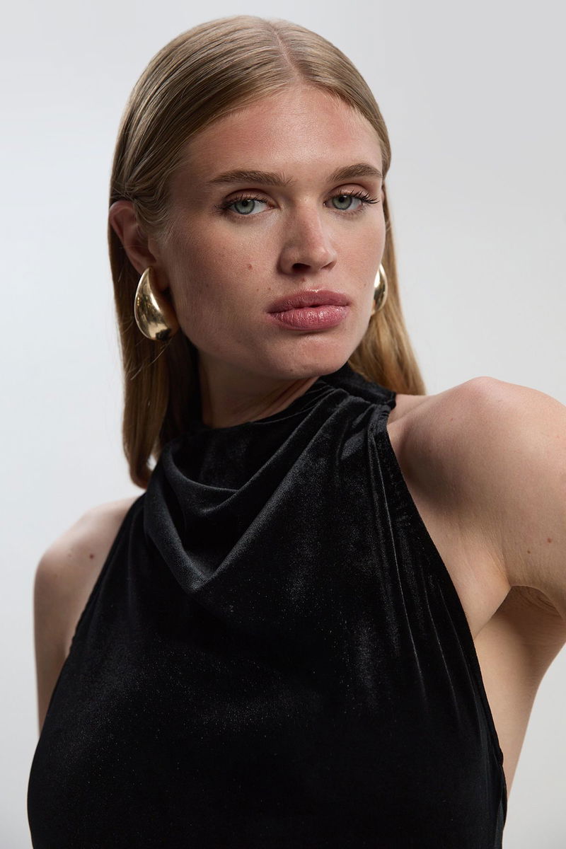 Petite Stretch Velvet High Neck Cape Shoulder Bodysuit