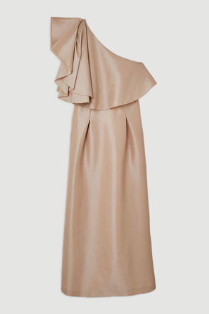 Make a statement in this petite midi dress, made in high quality taffeta, featuring a fit that hugs the curves, and a one sleeve design with a ruffle accent at the shoulder. Style this dress with strappy heels for an outfit that will turn heads from wedding guest nights to upcoming occasions and events.