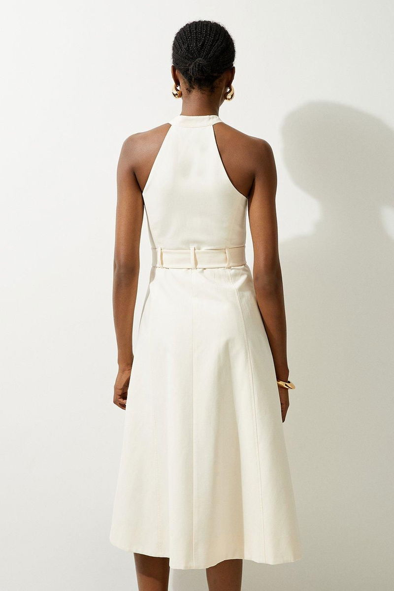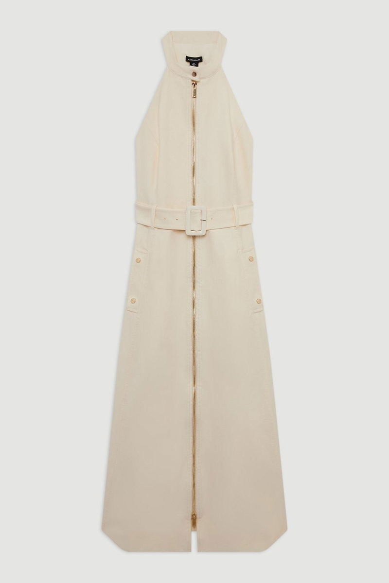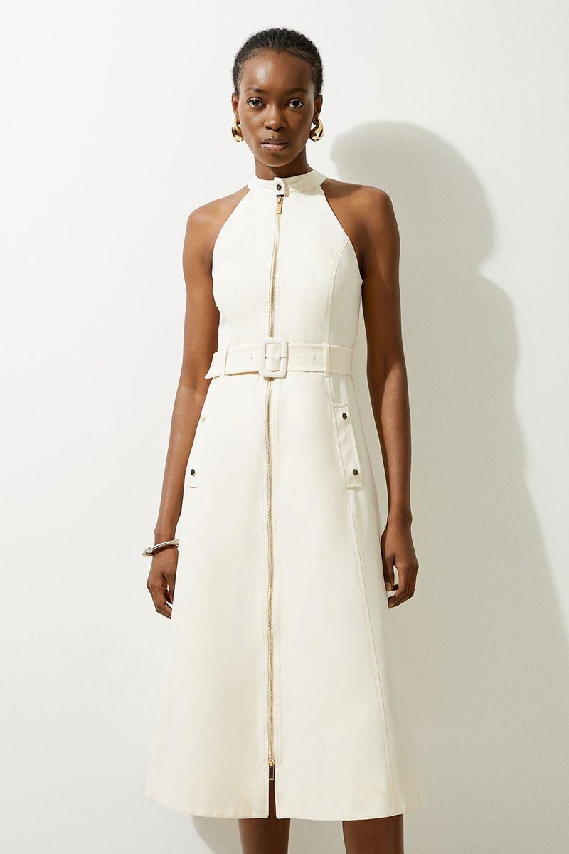 Go seamlessly from day to night in our petite midi dress, with a metallic zip in the centre, as well as a belted waist for a cinched silhouette, and a long, full skirt.
