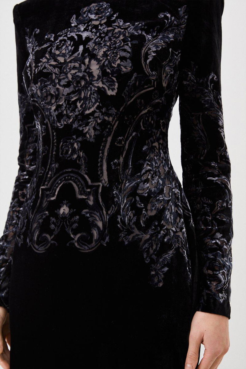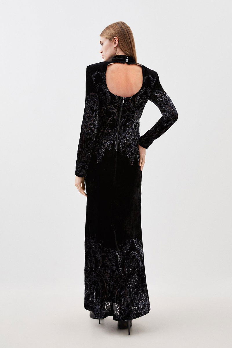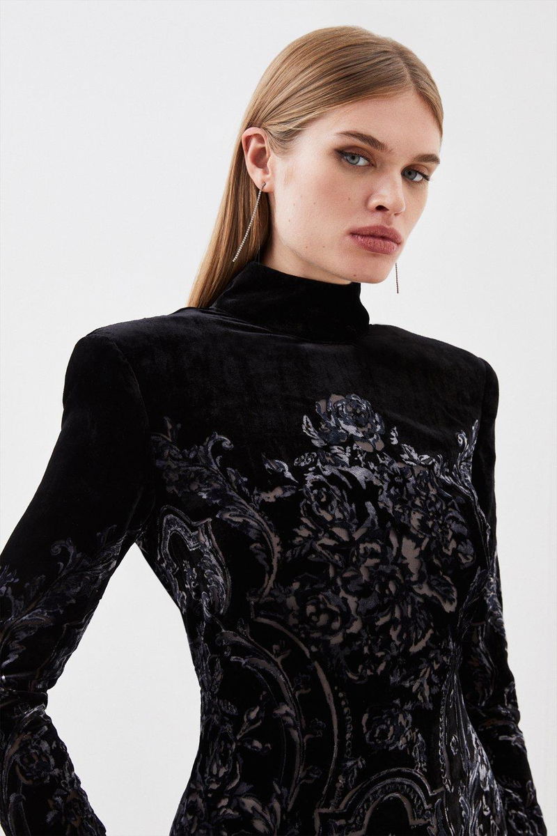 Exude a dark romance and sleek appearance, featuring a high neck and long sleeves, while a Devore print adorns satiny velvet. Cut by a maxi skirt with a side-leg split for added allure. Pair with barely-there heels for elevated occasionwear.