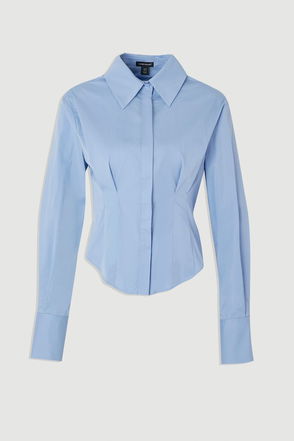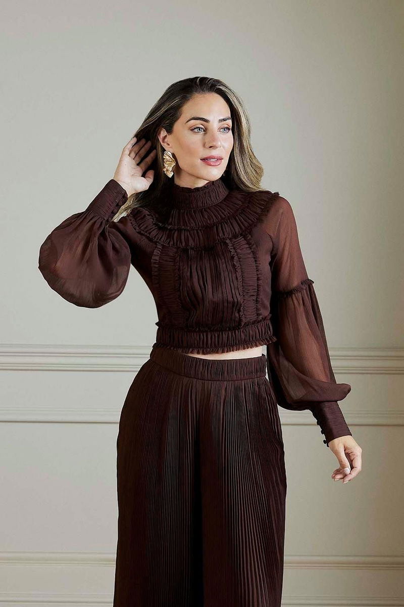 Feel formal in this blouse, with a universally silhouette that cinches in at the waist, and a high neckline. The textured pleats, as well as the buttons down the back make for an elevated shirt option for day to night dressing. Style this piece with jeans for a casual approach, then with the matching trousers for a co-ordinating evening look.