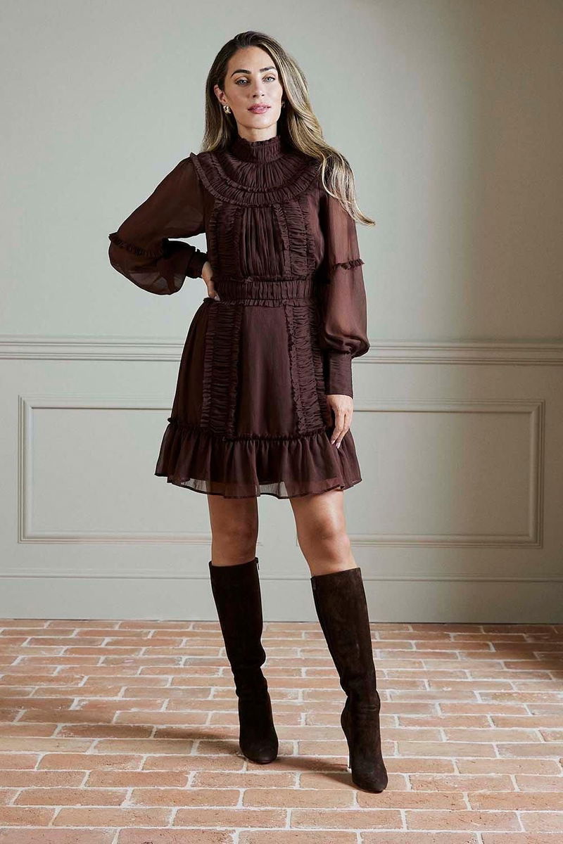 Pleat Crinkle High Neck Drama Sleeve Woven Mini Dress