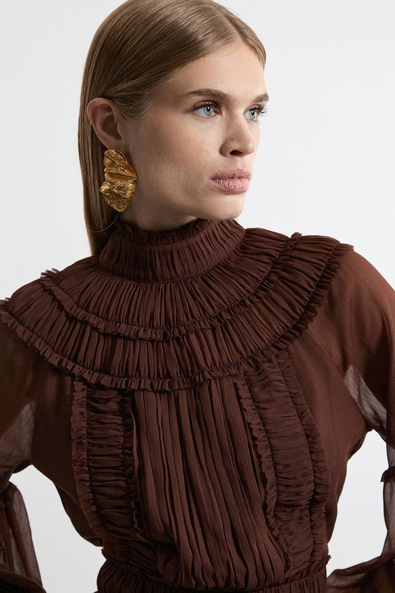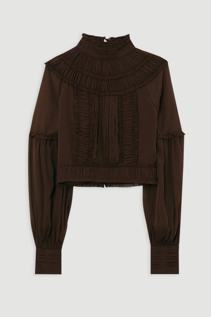 Feel formal in this blouse, with a universally silhouette that cinches in at the waist, and a high neckline. The textured pleats, as well as the buttons down the back make for an elevated shirt option for day to night dressing.
