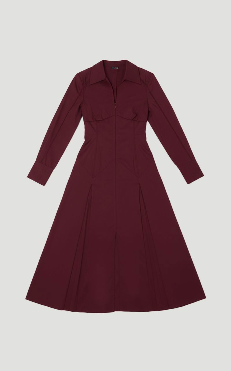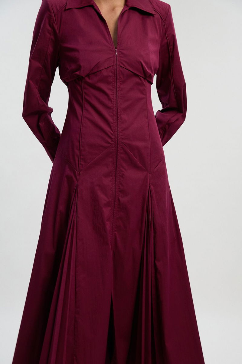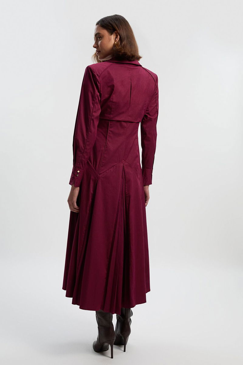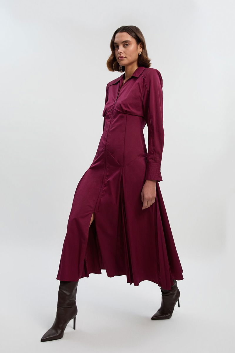 Pleated Detail Cotton Long Sleeve Woven Midi Dress