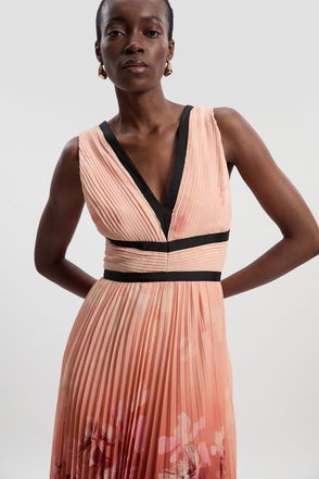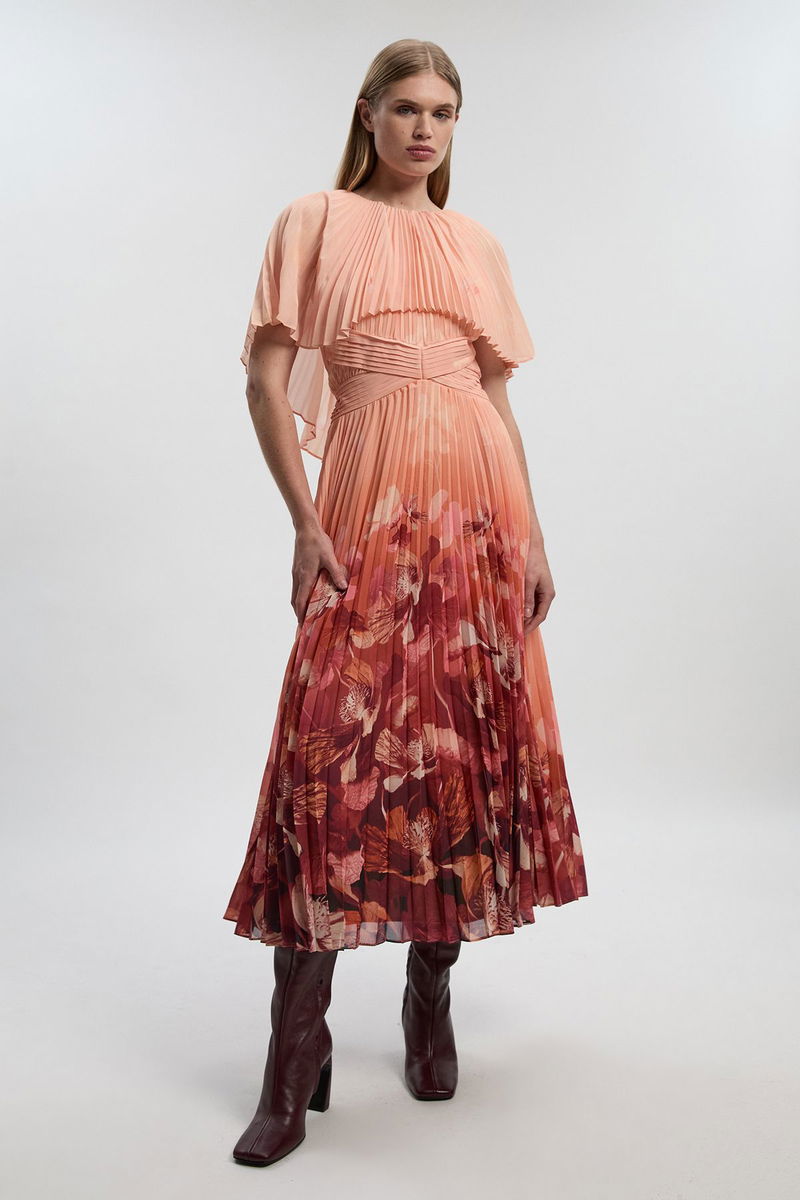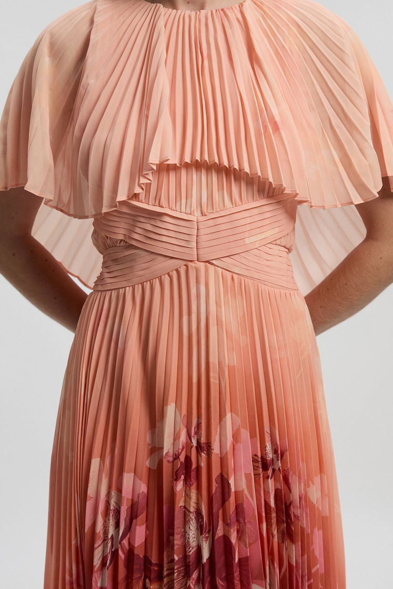 Pleated Floral Cape Sleeve Low Back Maxi Dress