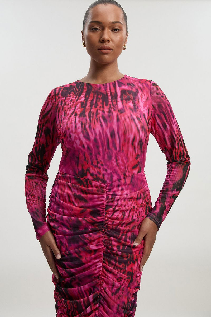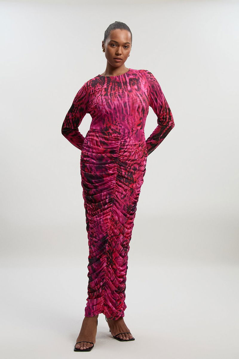 Plus Size Animal Print Mesh Ruched Maxi Dress
