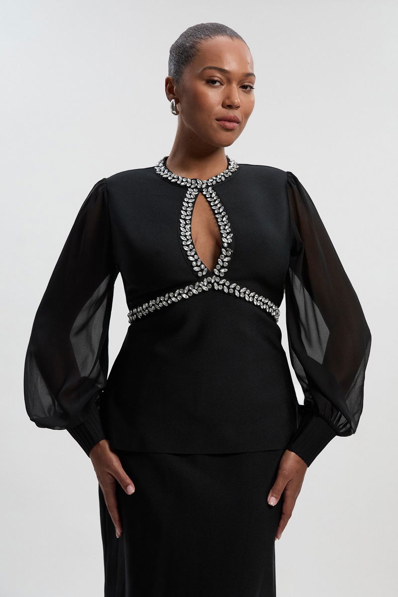 Plus Size Bandage Embellished And Chiffon Sleeve Figure Form Knit Top