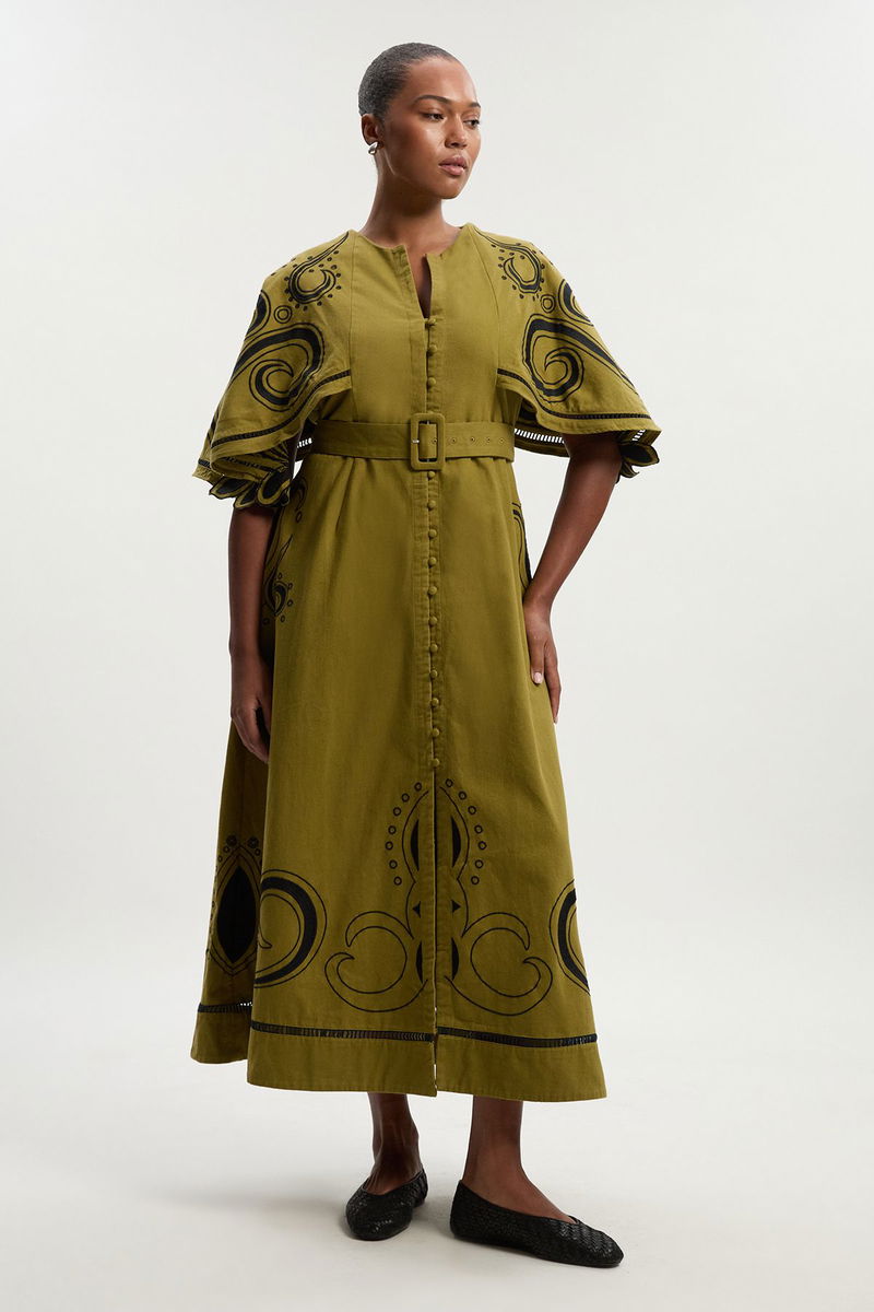 Plus Size Baroque Embroidered Cape Sleeve Twill Woven Maxi Dress