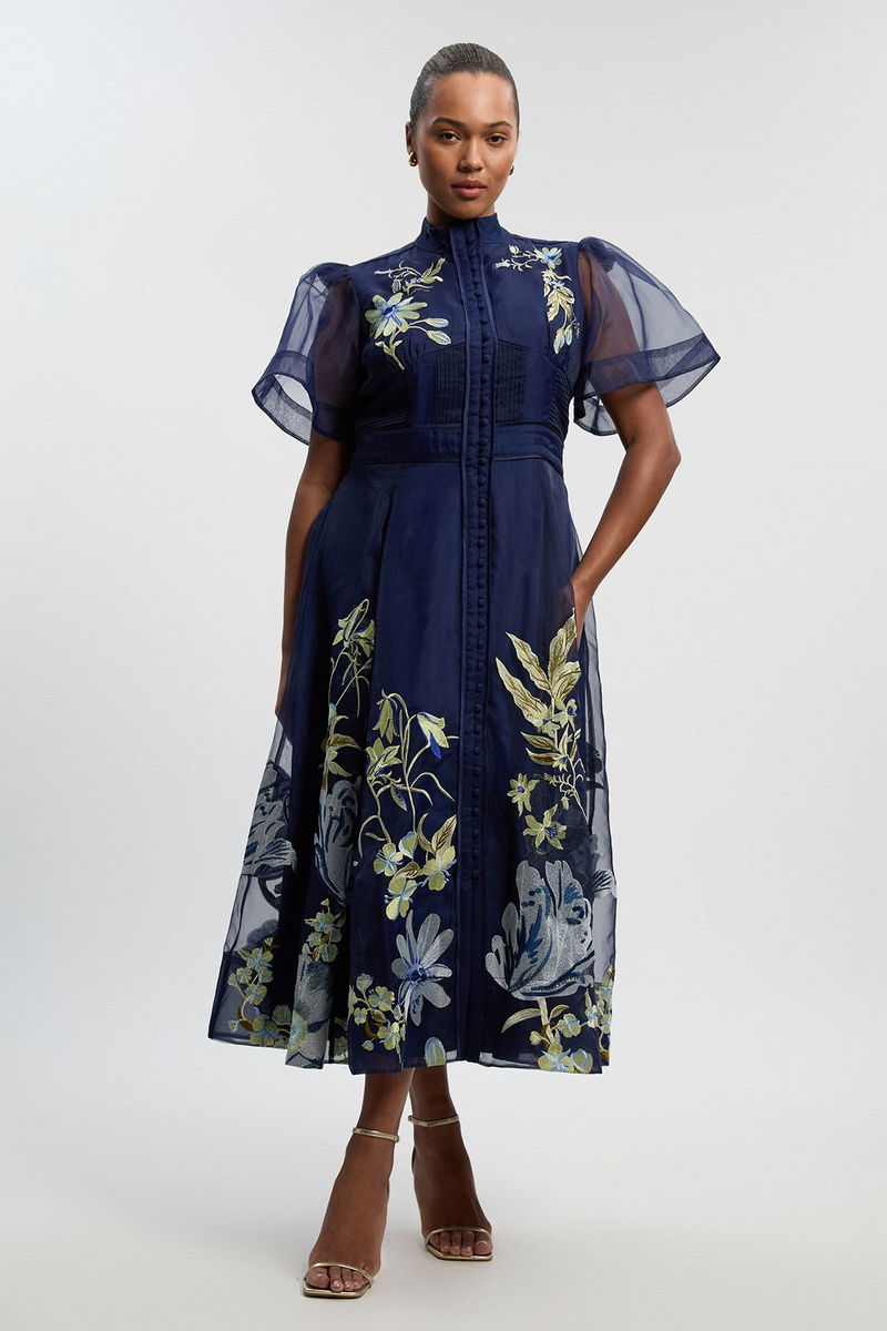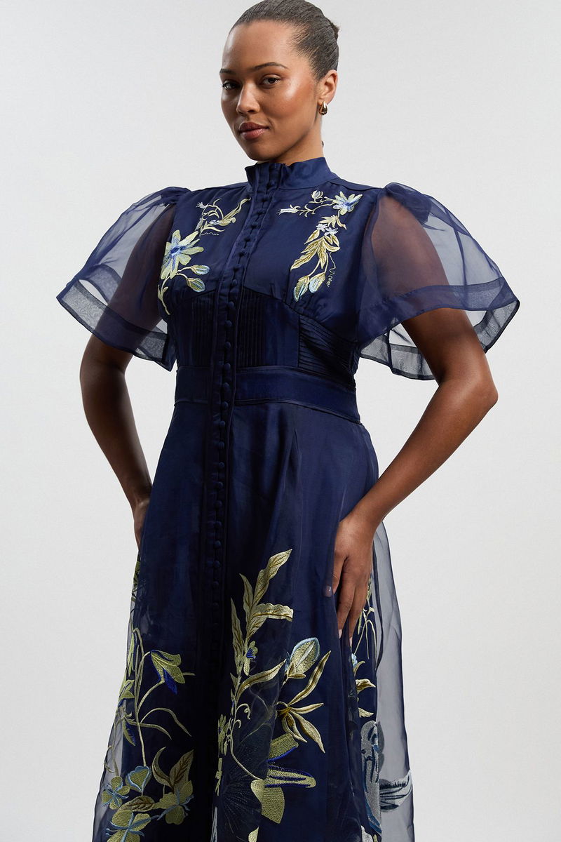 Plus Size Botanical Embroidery Organdie Angel Sleeve Midi Dress