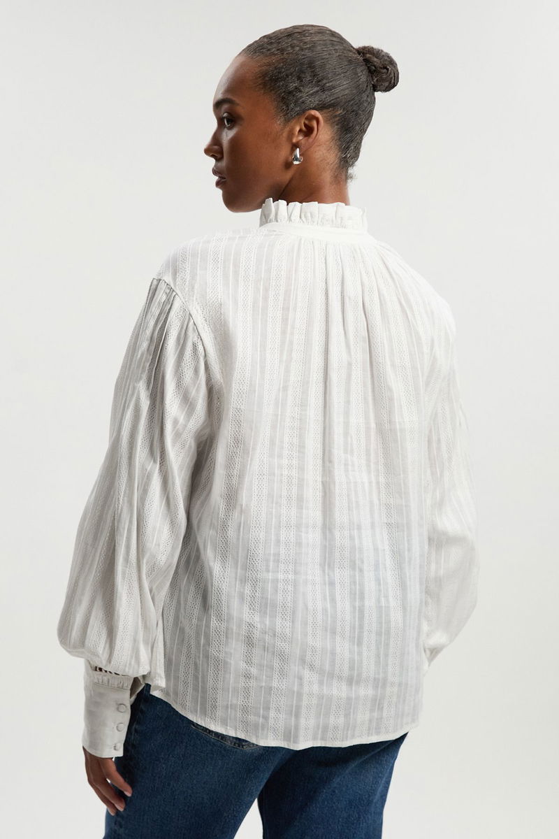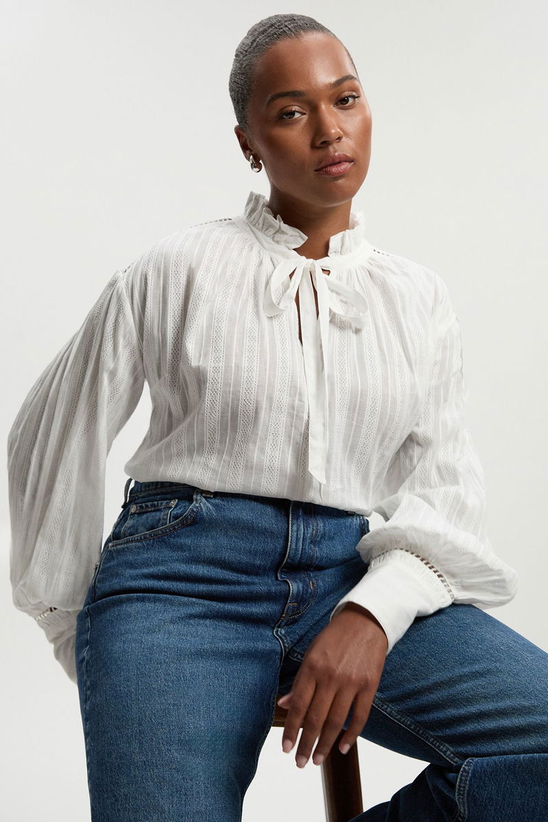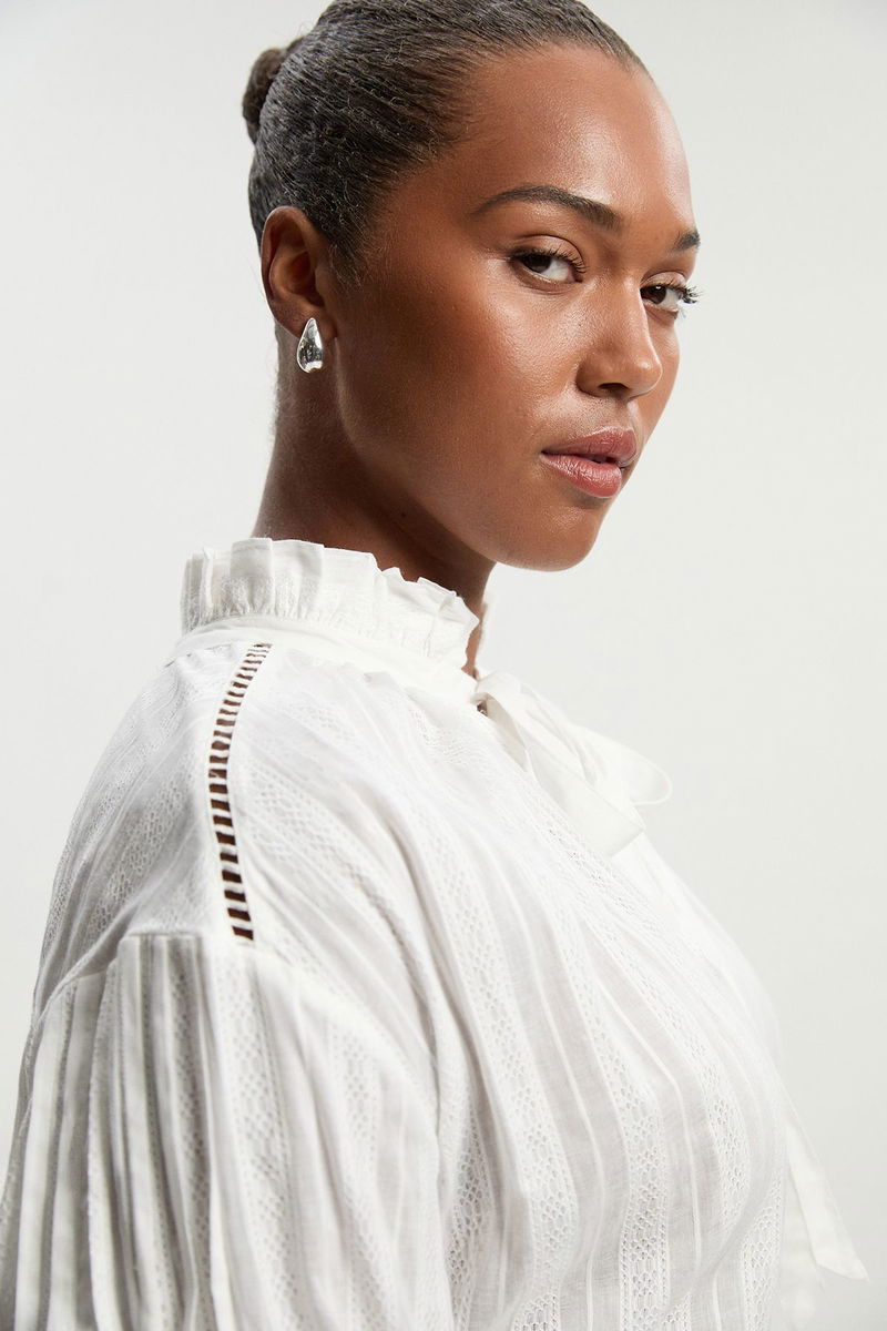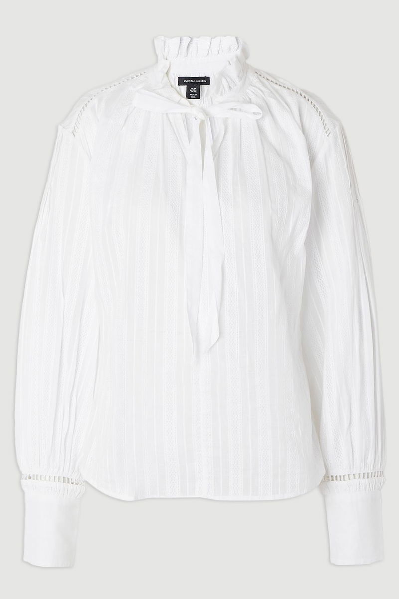 This Karen Millen blouse combines contemporary design with classic elements for a piece that transitions effortlessly from day to evening. The high neck with lace trim detailing adds a touch of sophistication, while the statement puff sleeves create a fashionable silhouette that's both on-trend and timeless.