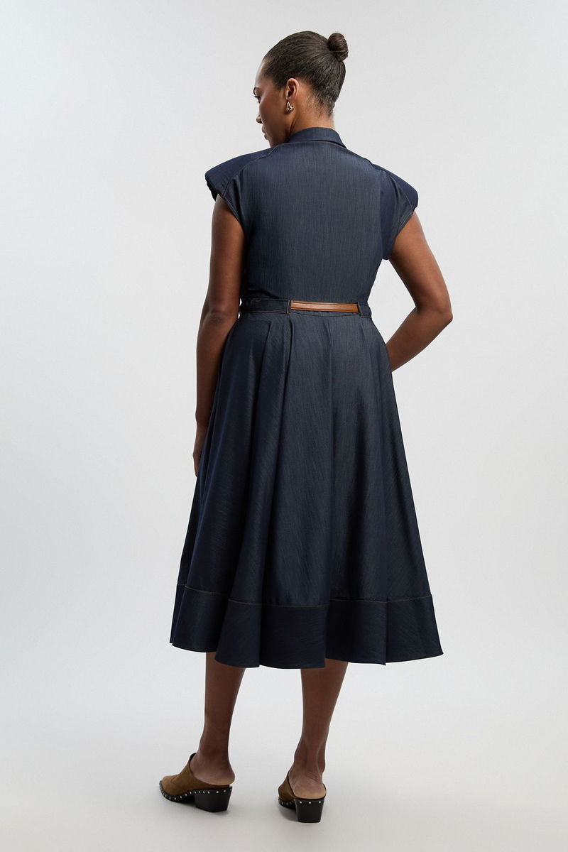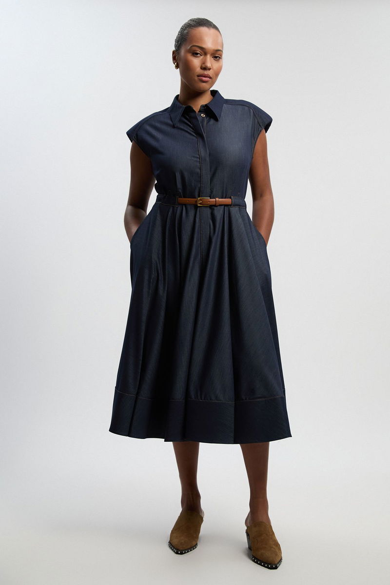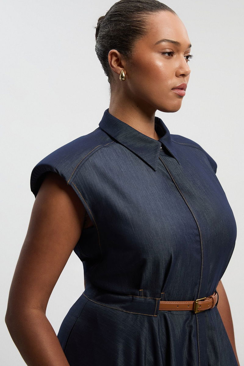 Plus Size Denim Tailored Belted Collared Full Midi Dress