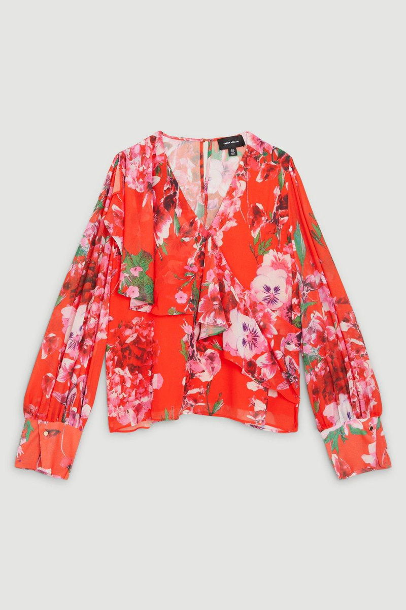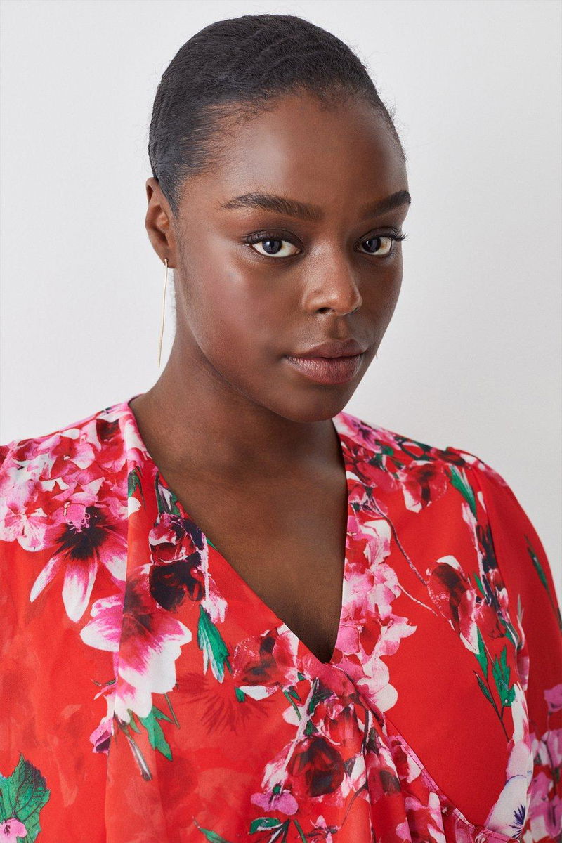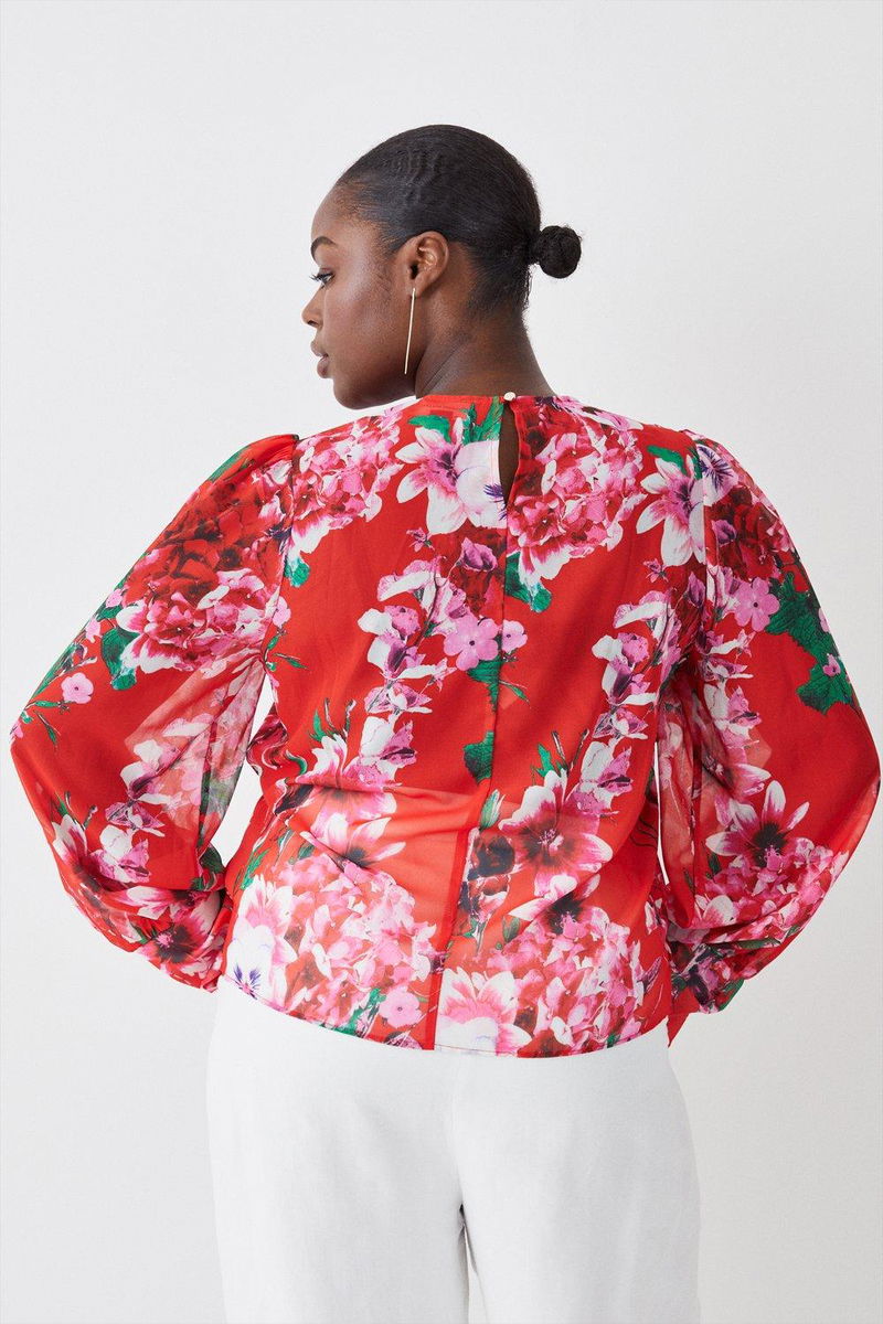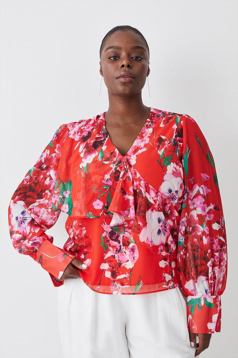 Plus size floral hydrangea georgette ruffle detail blouse.