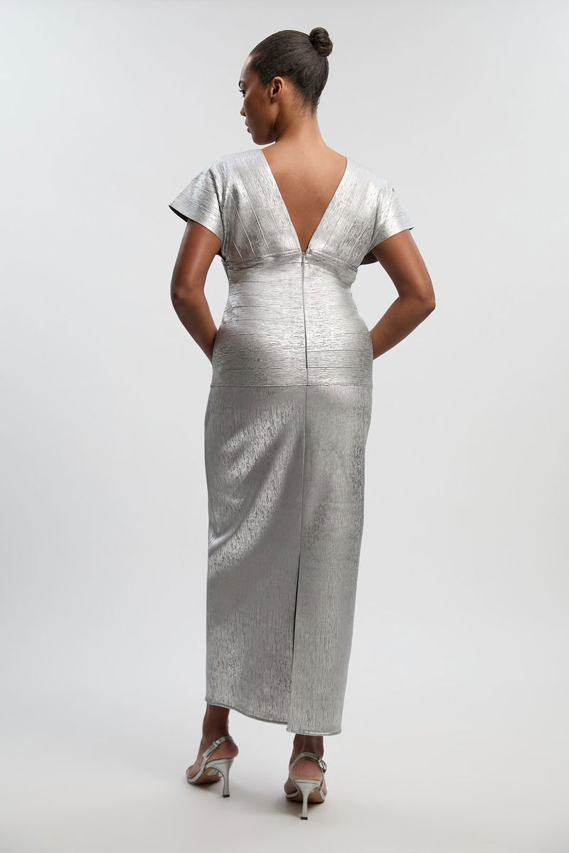 Plus Size Foil Metallic Figure Form Bandage Angel Sleeve Knit Maxi Dress