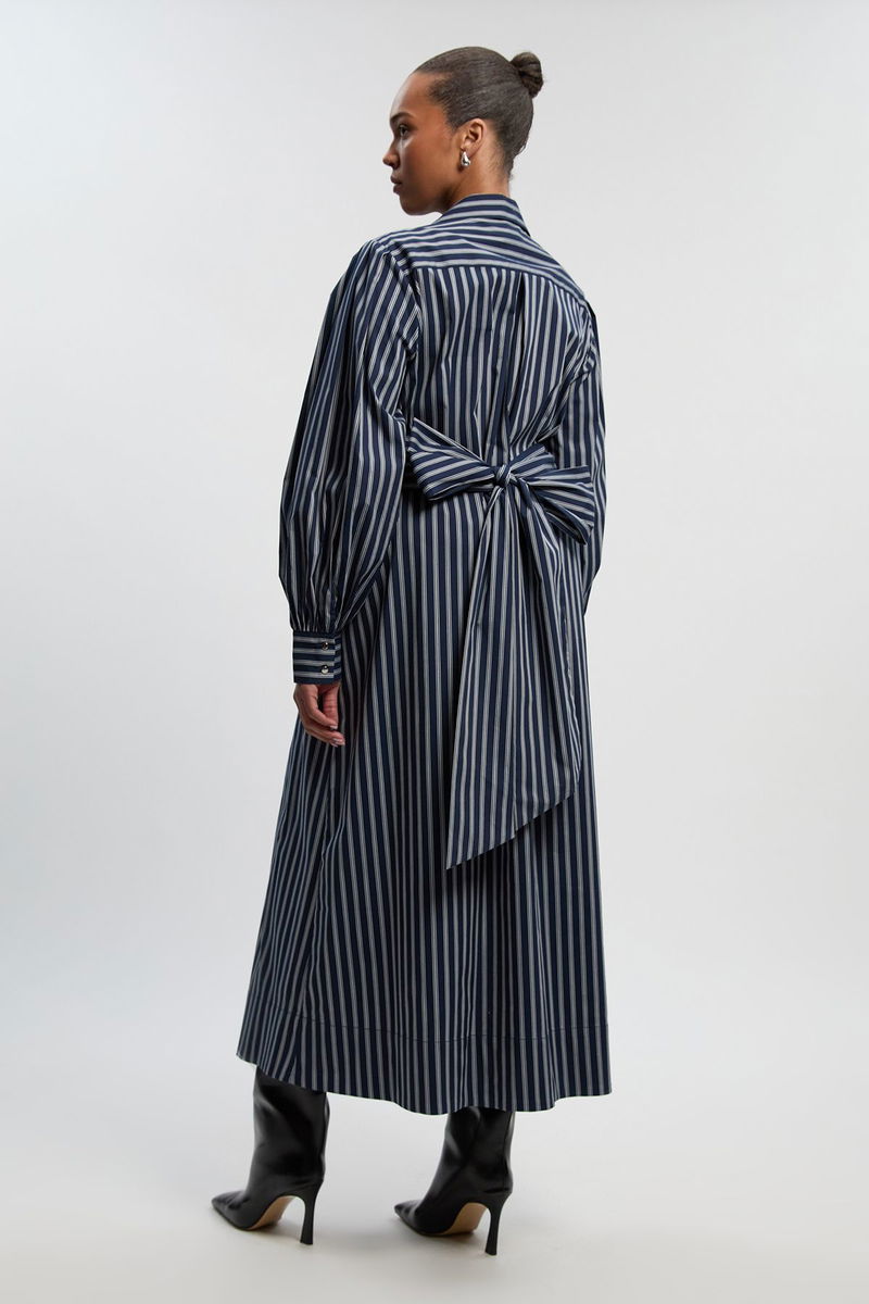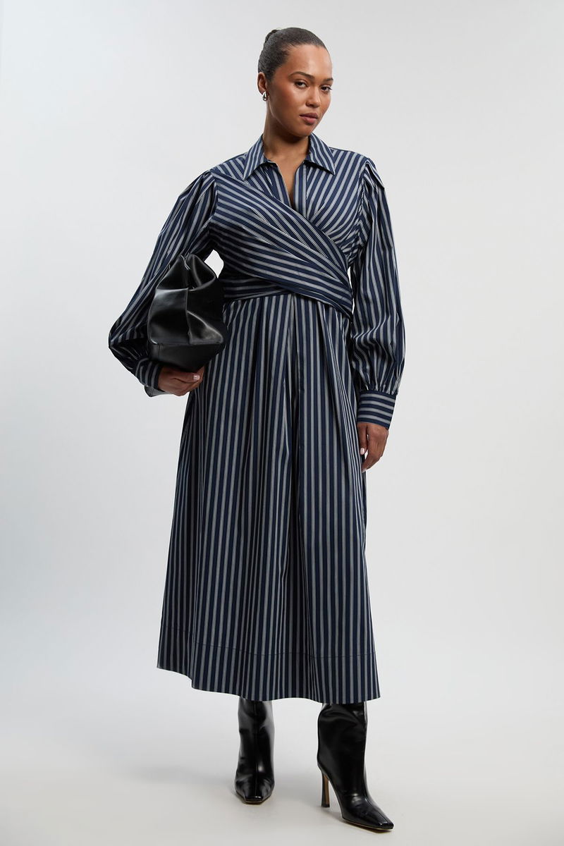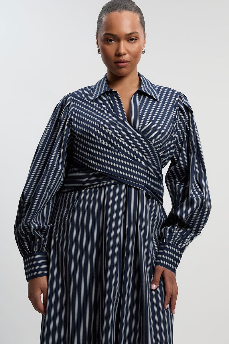 Plus Size Stripe Cotton Poplin Drama Sleeve Woven Wrap Detail Shirt Dress