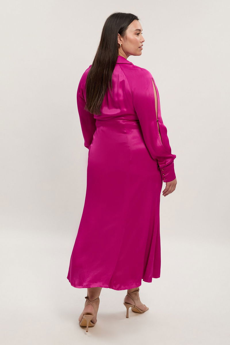 Plus Size Viscose Satin V Neck Long Sleeve Woven Midi Dress