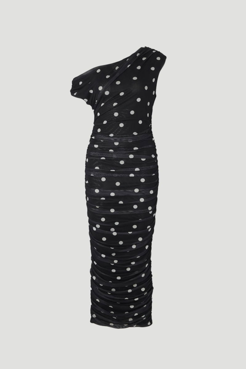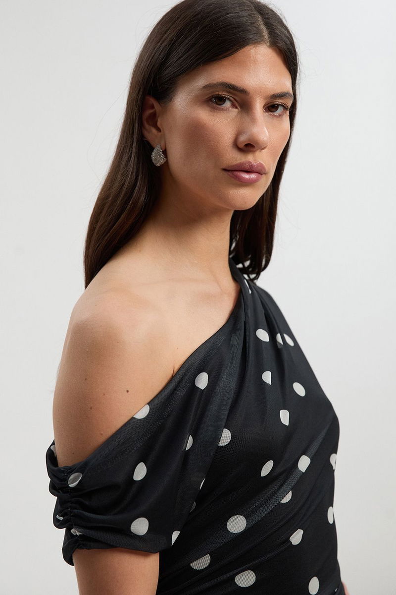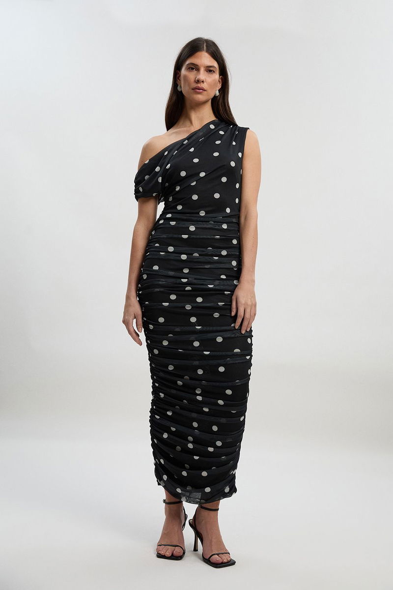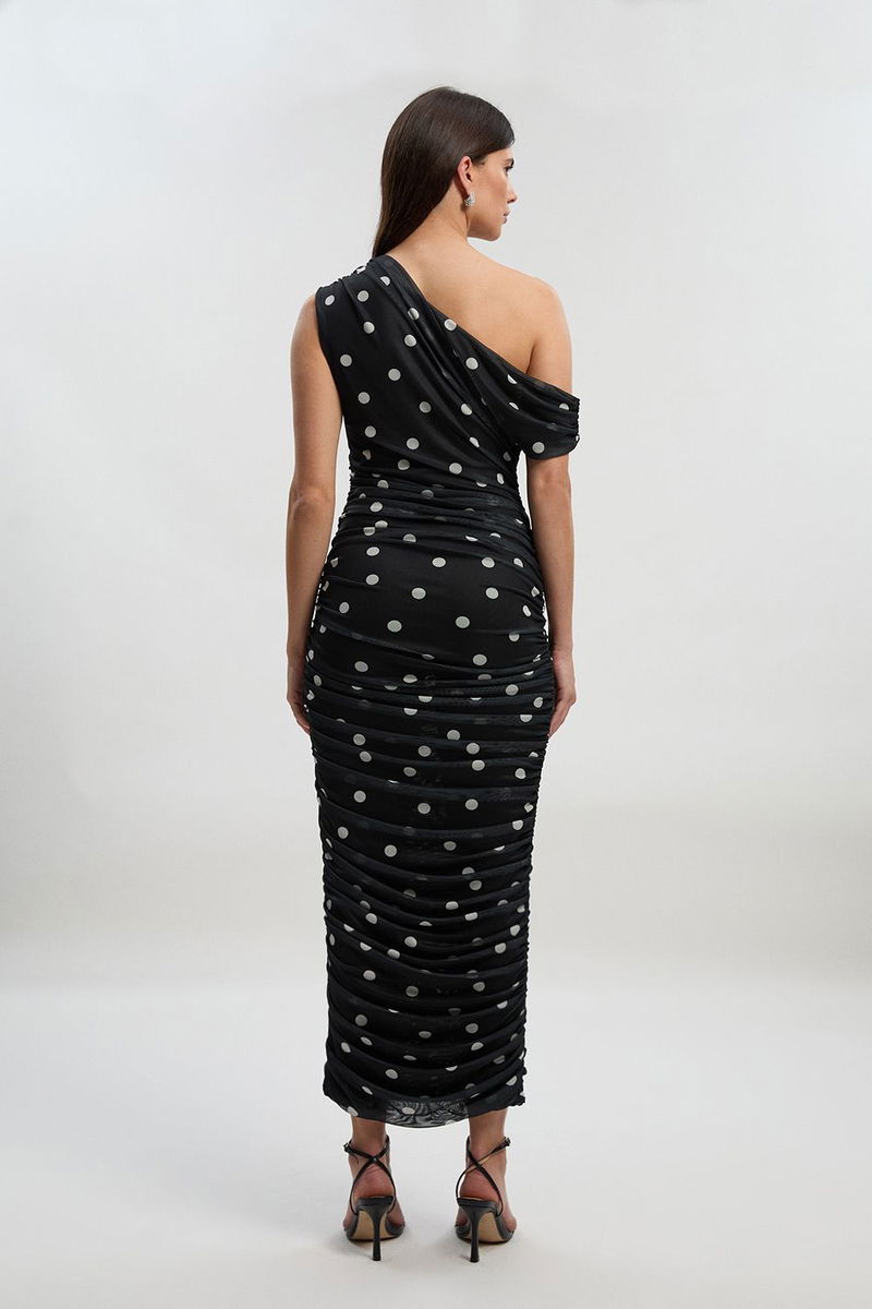 Polka Dot Mesh One Shoulder Ruched Midi Dress