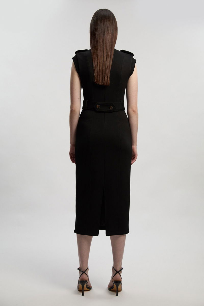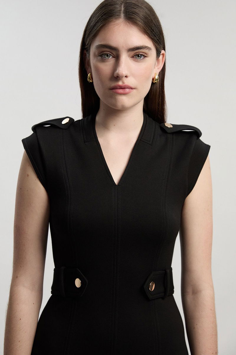 Ponte V Neck Tab Detail Midi Dress