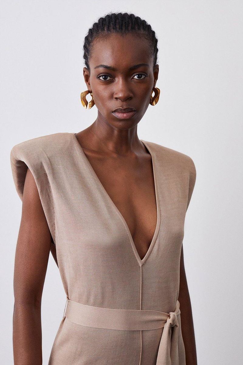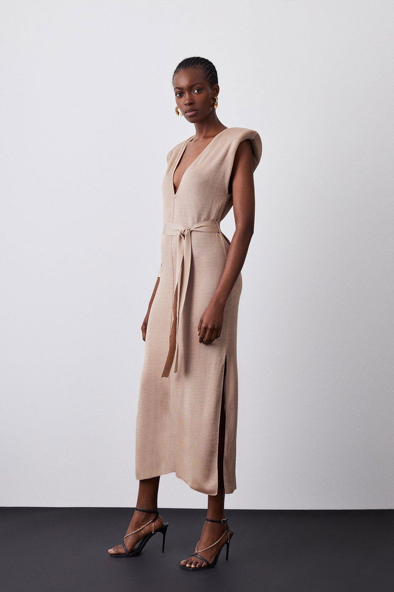 Power shoulder v neck slinky knit belted dress.