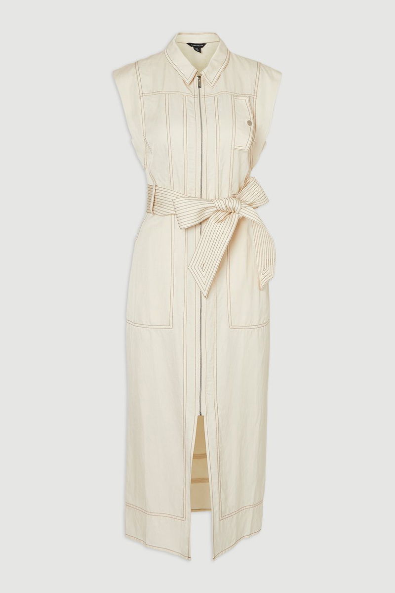 Premium Linen Twill Topstitch Woven Sleeveless Midi Dress
