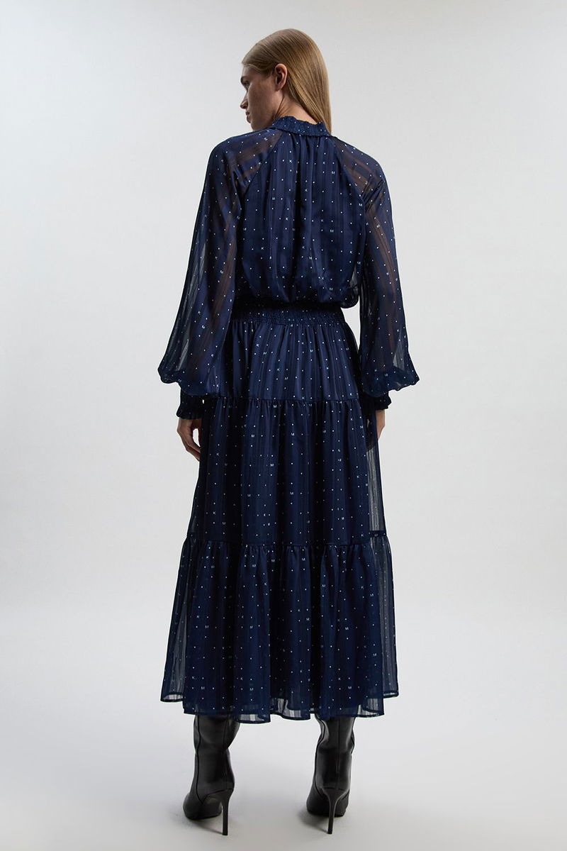 Print Shirred Detail Dobby High Neck Woven Maxi Dress
