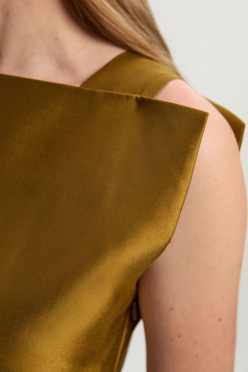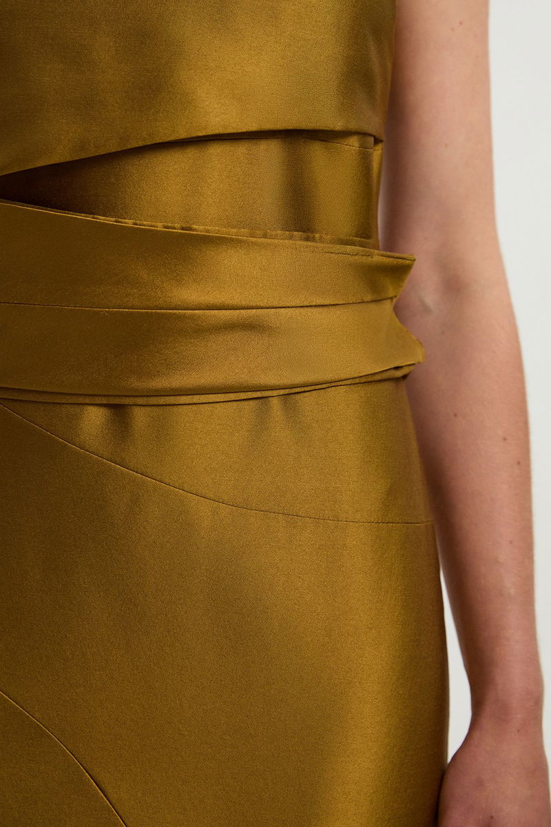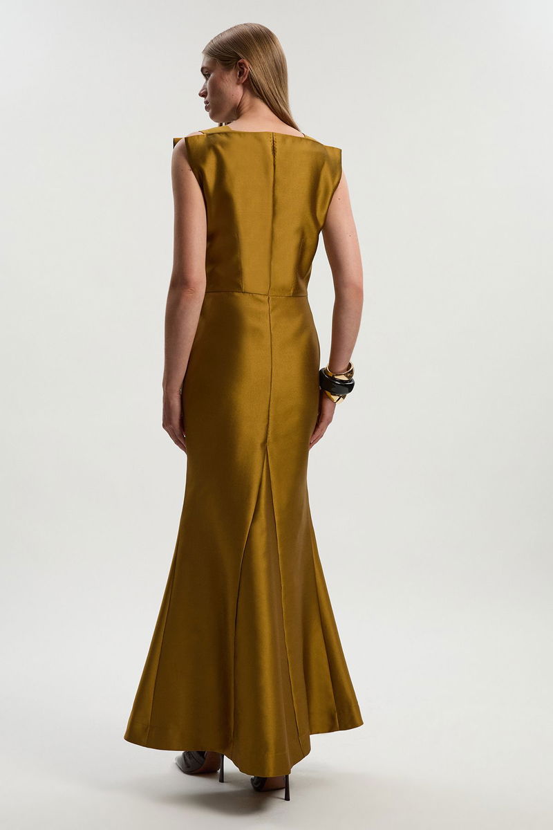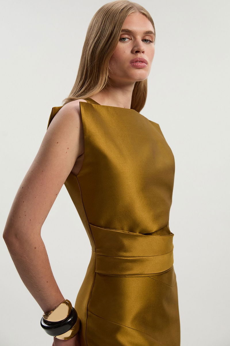 Satin Twill Draped Waist Structured Tailored Maxi Dress