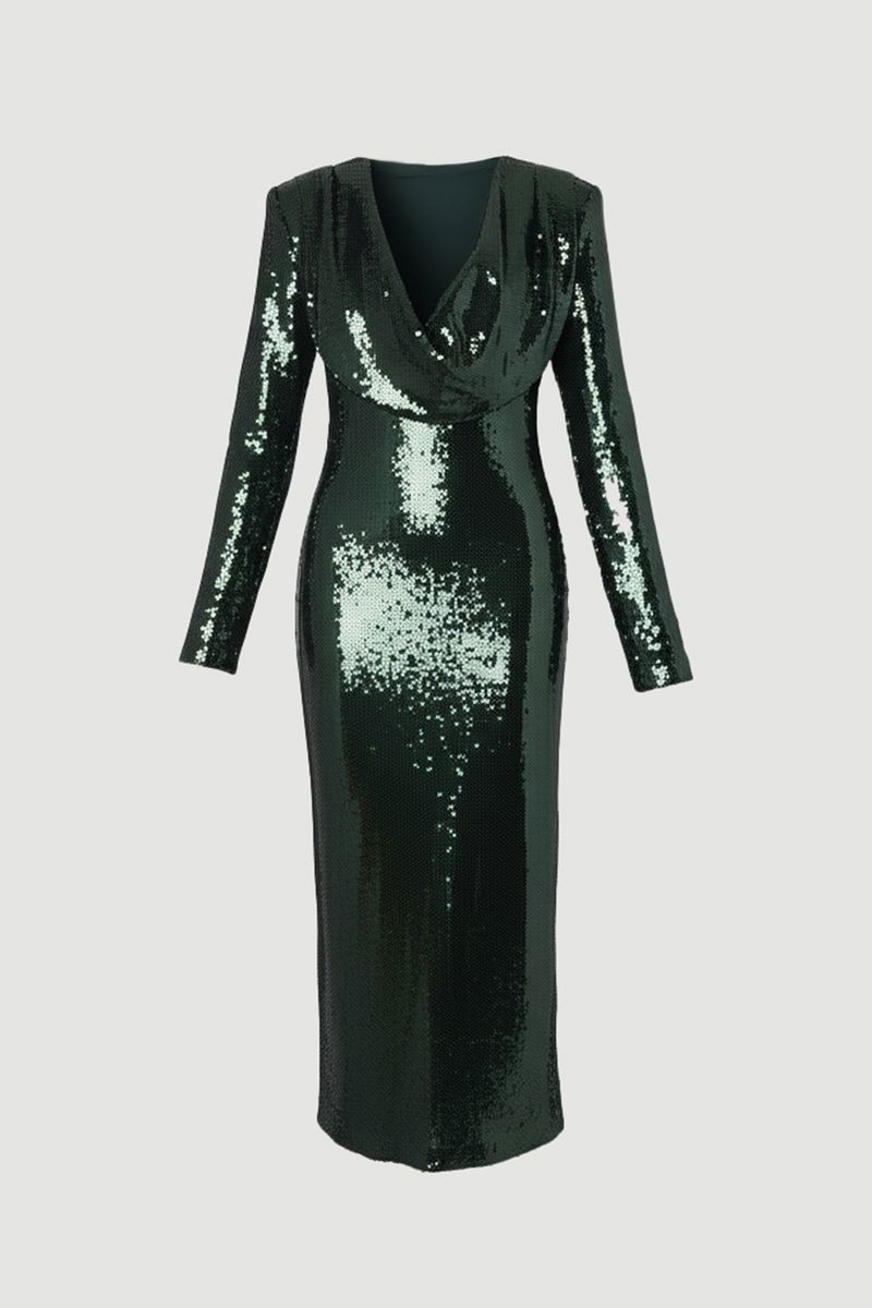 Sequin Plunge Cowl Neck Strong Shoulder Long Sleeve Midi Dress