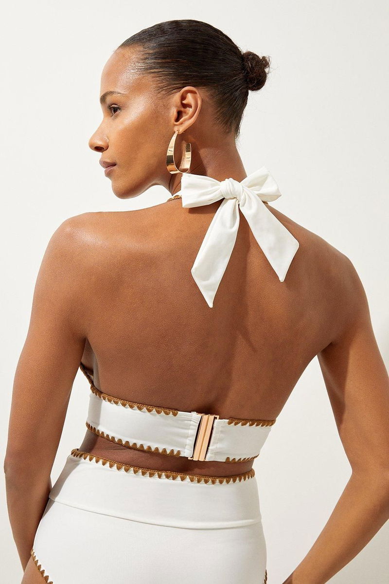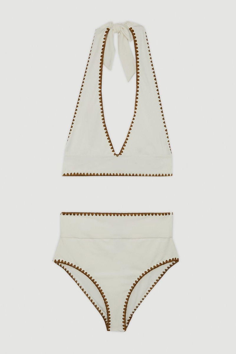 Welcome the sun with a bikini that will turn heads, the top of which features an ultra flattering plunge neckline and halter detailing, as well as wide shoulder straps, and contrasting stitch details.