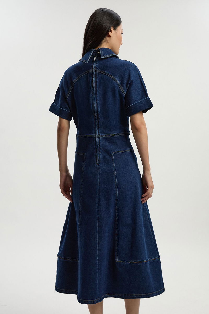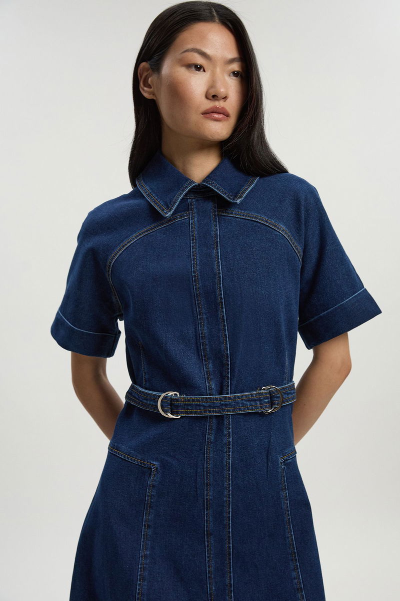 Stretch Denim Tab Belt Detail Midi Dress