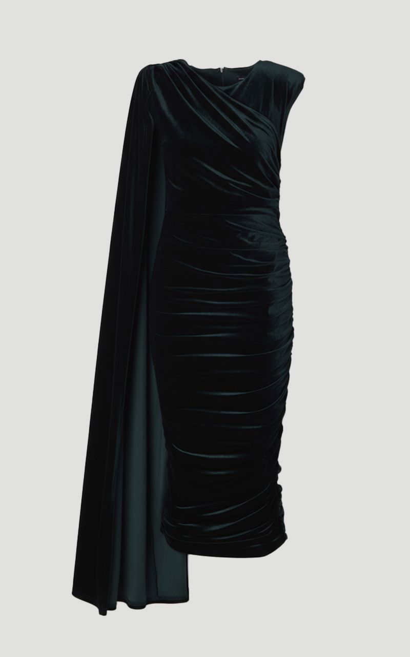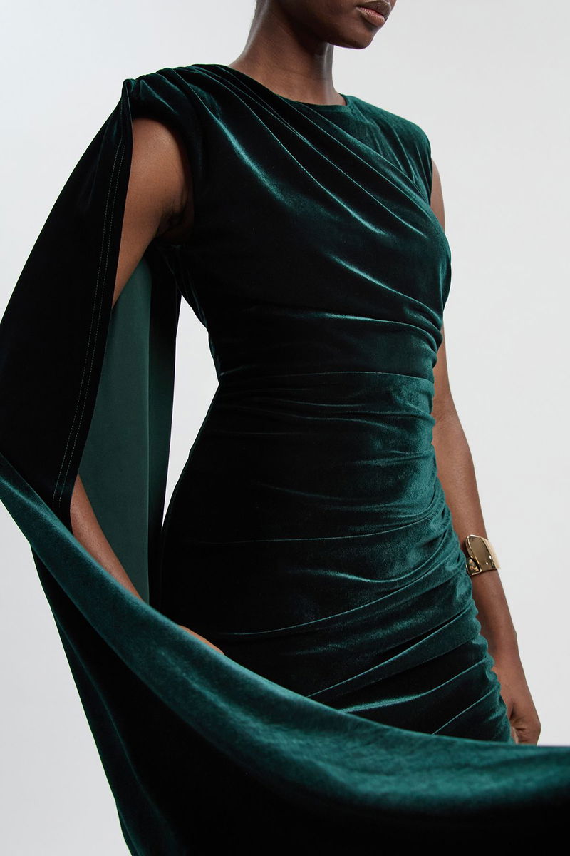 Stretch Velvet Crew Neck Cape Shoulder Maxi Dress