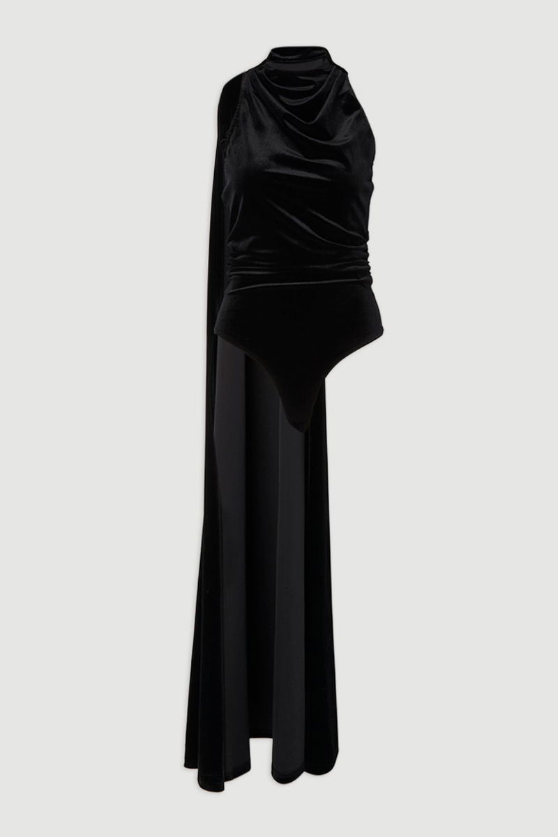 Stretch Velvet High Neck Cape Shoulder Bodysuit