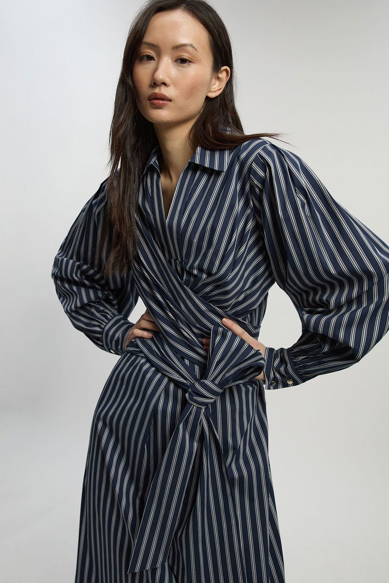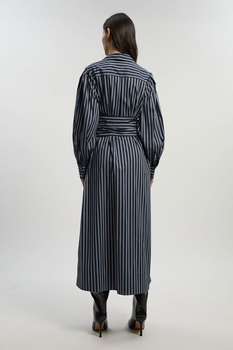 Stripe Cotton Poplin Drama Sleeve Woven Wrap Detail Shirt Dress