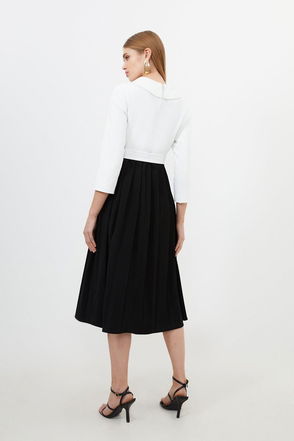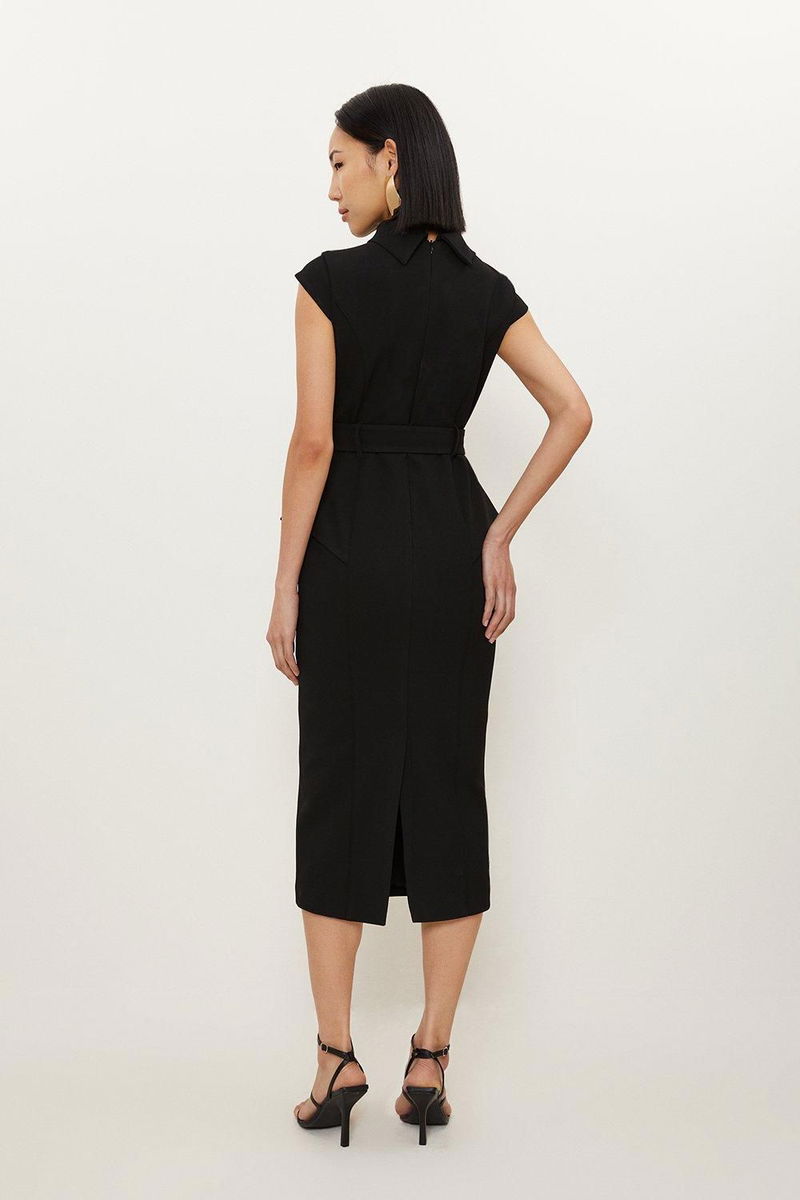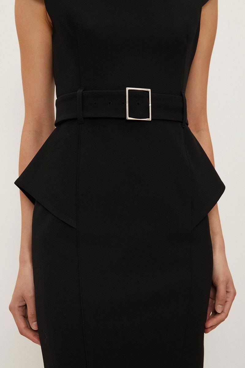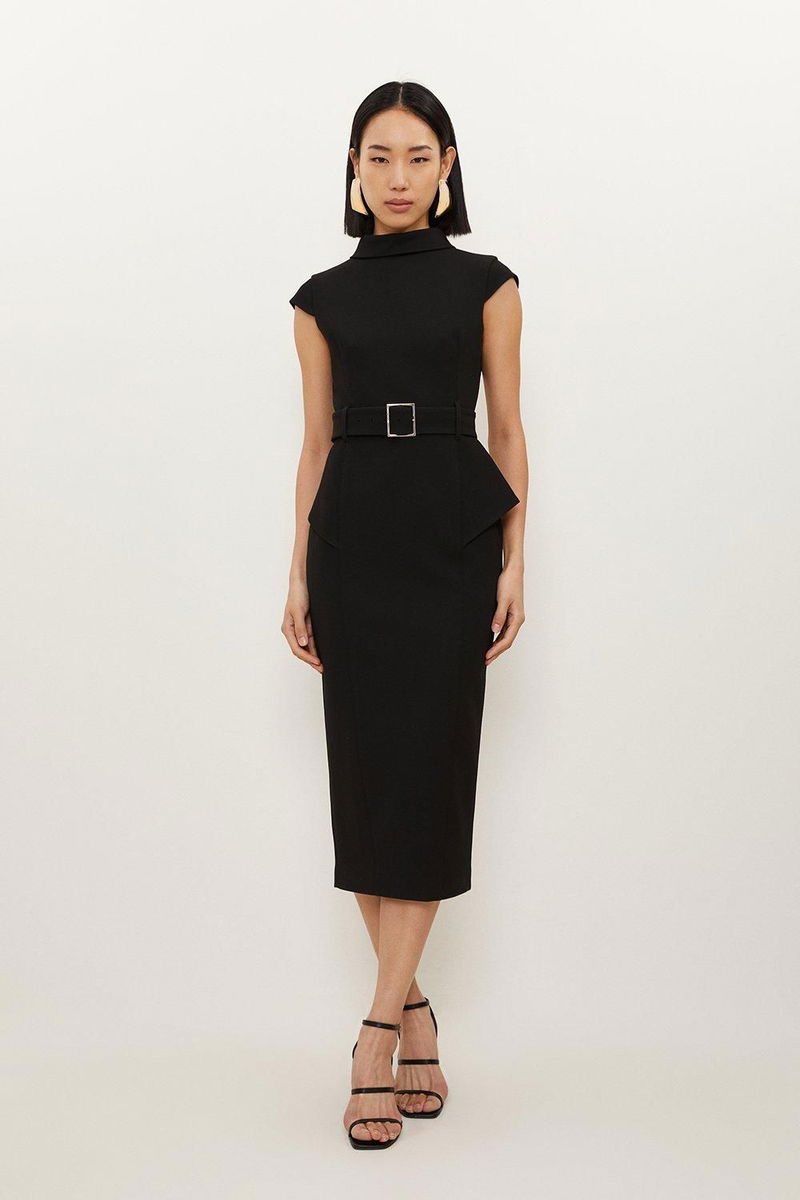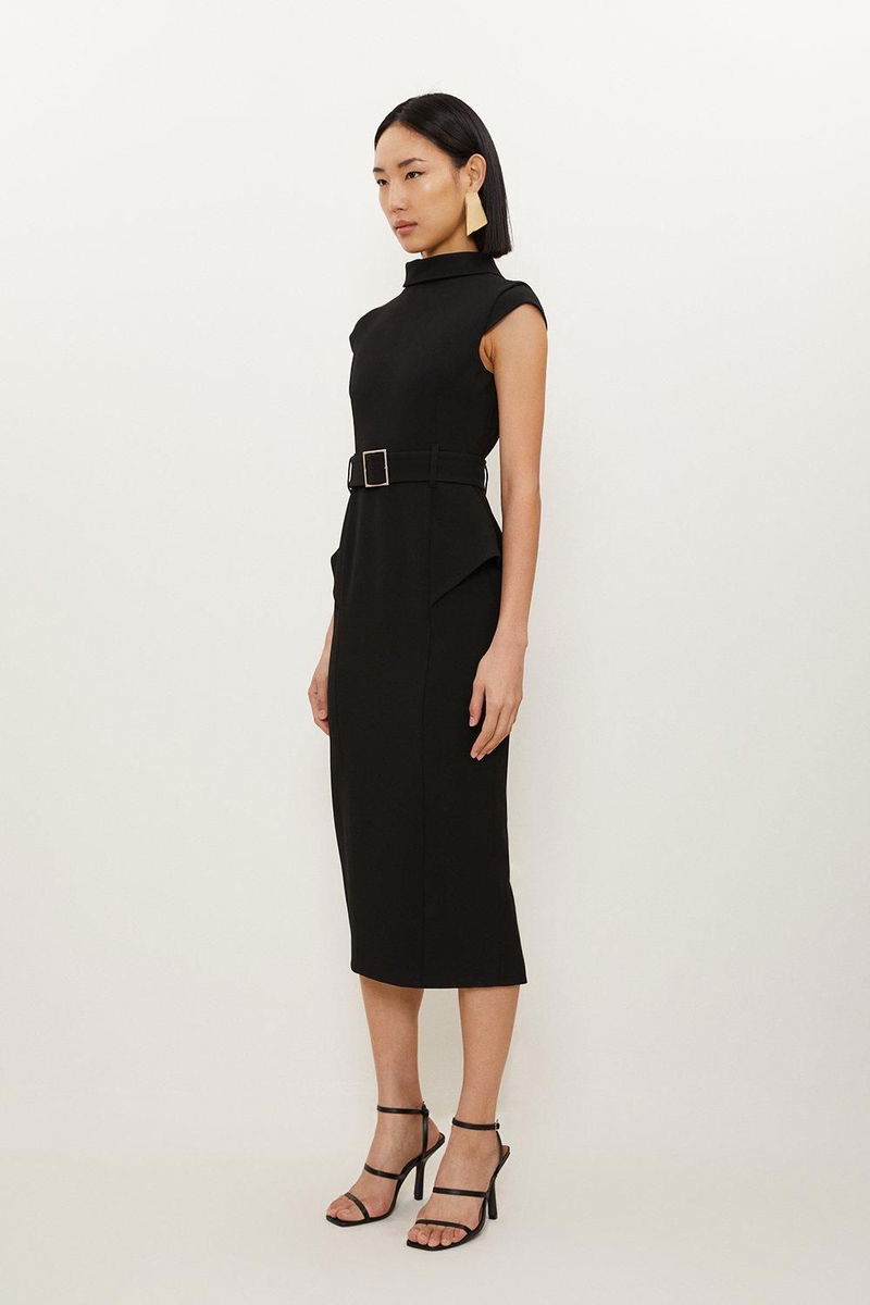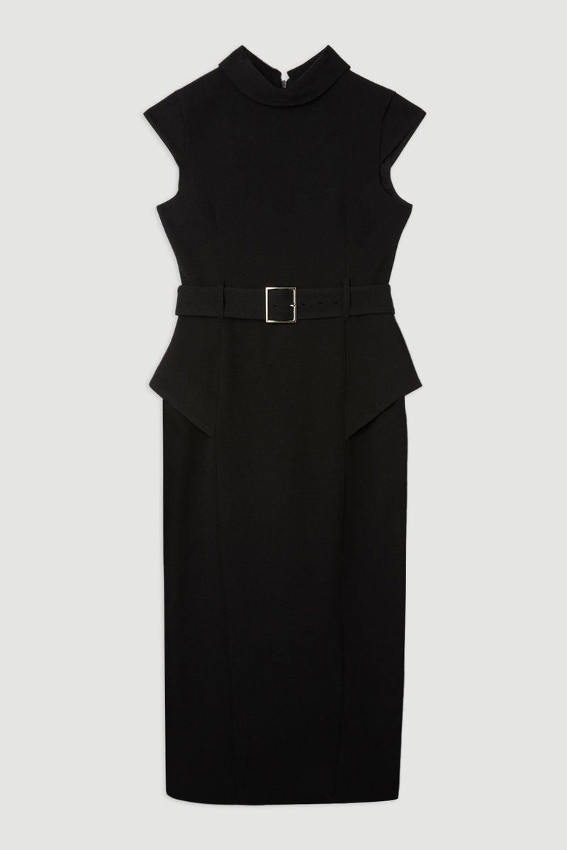 Structured Crepe Roll Neck Peplum Belted Midi Dress