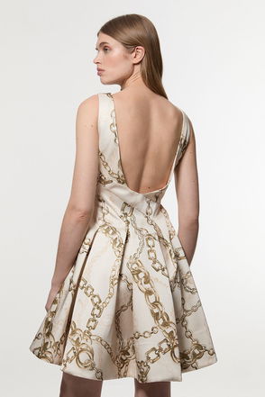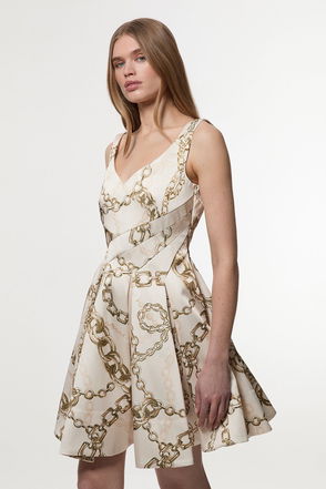 With a romantic twist, this formal dress is crafted to turn heads all evening long. The enchanting full skirt is cut to a high waist and features a mini length that sits midway down the thighs and skims the hips for a flattering fit. The sweetheart neckline of the bodice enhances the décolletage, and the directional stitching to the pleats cinches the silhouette. Indulge in elevated formality and style with strappy heels.