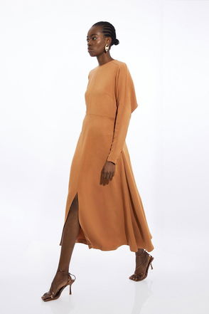 Feel formal in this midi dress, with a cape sleeve design, and a sweeping silhouette, embellished with metallic studs. Style this dress with strappy heels for an outfit that will turn heads from wedding guest days to upcoming occasions and events.