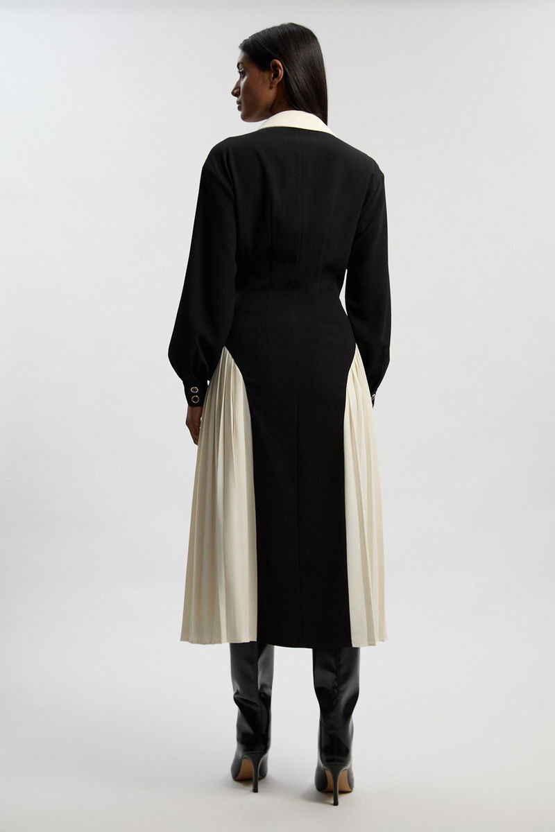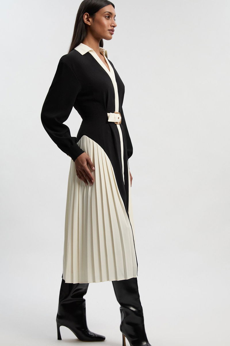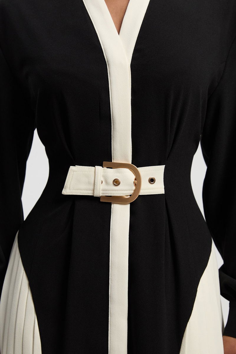 Tailored Crepe Colour Block Belted Pleated Midi Dress
