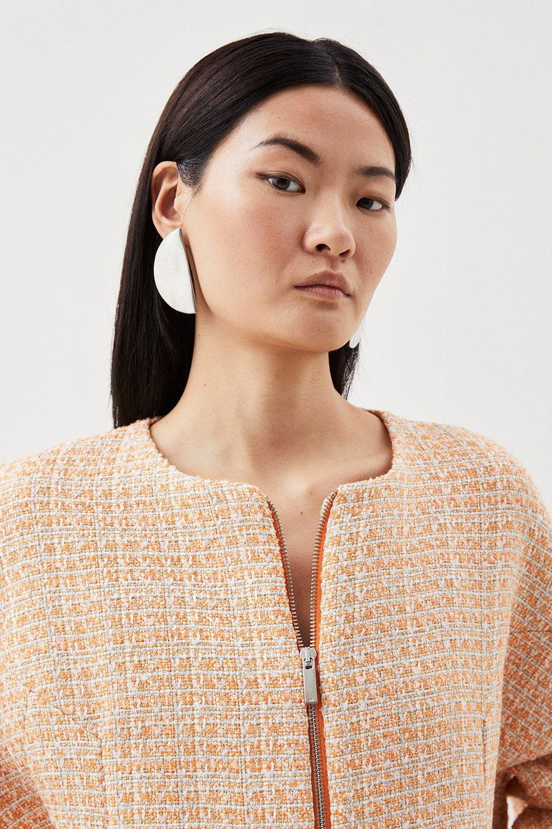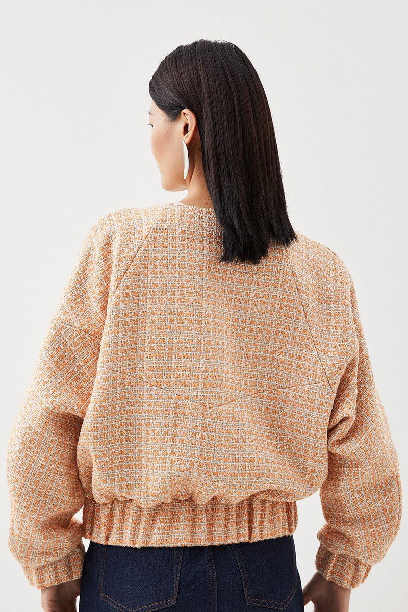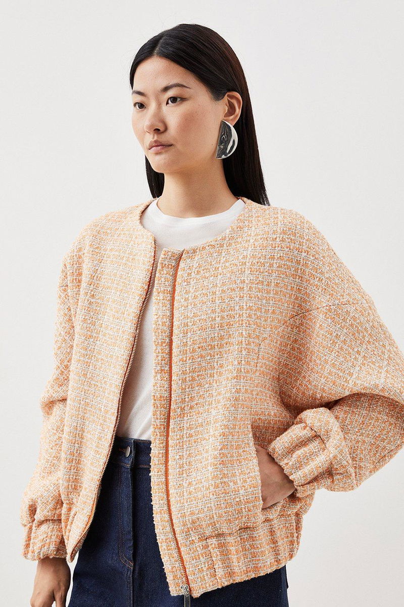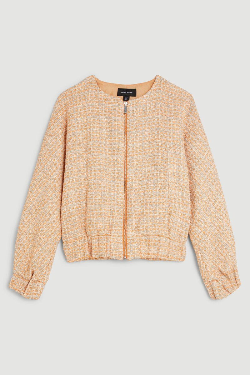 Elevate your style to celestial heights with this bomber jacket, exuding ethereal allure with bouclé fabric, woven with glistening threads for texture. The bomber-style design offers a modern twist on a classic silhouette, while a ribbed collar to the sleek zip closure add functional detailing. Pair with the matching skort for a trend-forward ensemble.