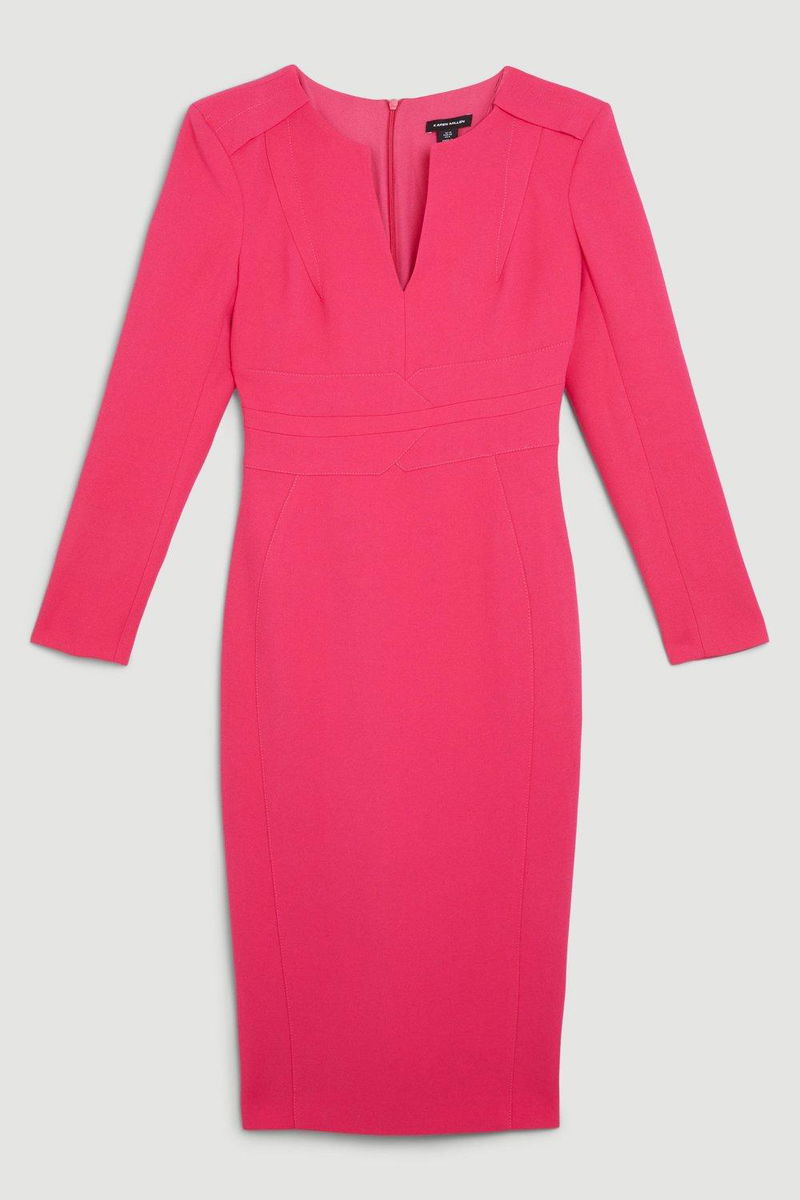 This midi dress exudes sophistication, elegantly tailored with compact stretch fabric, broad shoulders and a waist detail that cinches the silhouette. Long sleeves and a midi hemline make this piece a perfect choice for all-year round elegance.