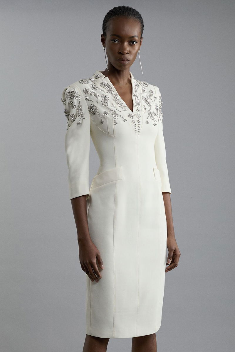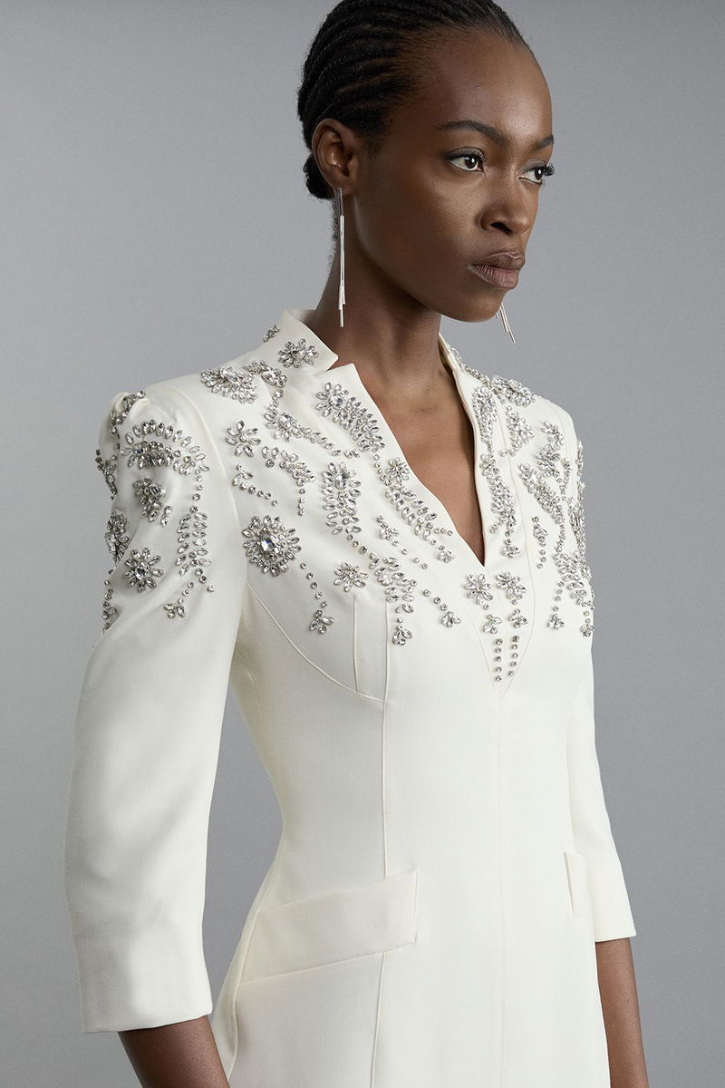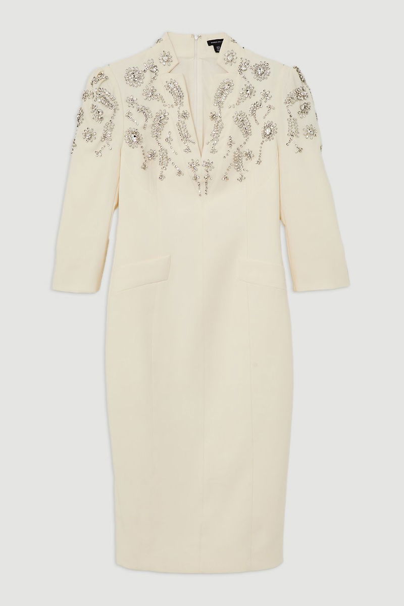 Meet the everlasting style icon – the Forever Dress. A timeless addition to any well-considered wardrobe, this piece features a V-neck front, a figure skimming silhouette, and sparkling embellishments. Feel elevated in our midi dress, as the structured shoulders bring the drama, the shimmering crystals elevate the formality, and the timeless fit fills you with confidence. Style it with heels or loafers for an elevated evening look, perfect for year-round wear.