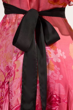 This Karen Millen tall midi dress combines timeless elegance with contemporary design elements. The striking floral pattern cascades across the woven fabric, while the pleated godet panels create mesmerising movement with every step. The plunge neckline framed by contrasting trim draws the eye, while the empire waistline with its tie detail defines your silhouette . Style with strappy heeled sandals and delicate drop earrings for summer weddings or garden parties. For more formal occasions, pair with a structured clutch and a sleek updo to showcase the neckline. The versatile midi length works equally well for daytime events when styled with flat sandals and minimal jewellery for an effortlessly chic look that transitions seamlessly from afternoon to evening.