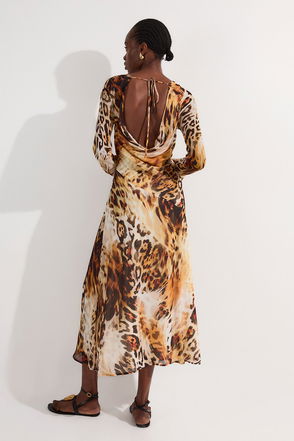 With a fit that flatters the curves, as well as a statement back, this tall dress is certain to turn heads. The contrasting, printed sleeves and cowl back make for striking detail, certain to turn heads. Style this piece with strappy heels for an occasion look perfect for parties and special events.