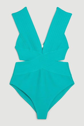 Enhance your swimwear collection with this timeless one piece swimsuit. Featuring a plunging halter neck design, an embellished detail and a stripe print for a modern touch.