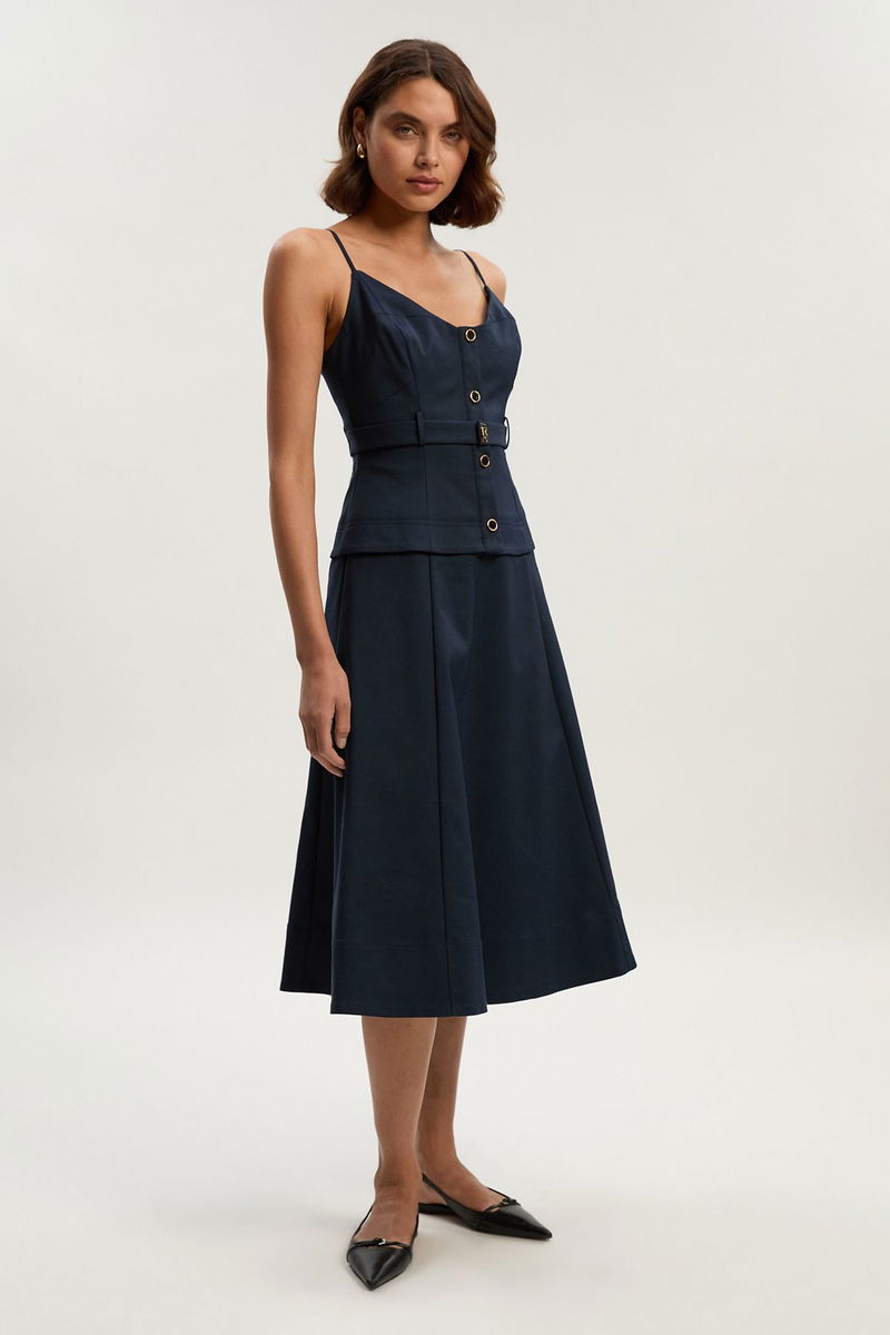 Techno Strappy Belted Hardware Detail Woven Midi Dress