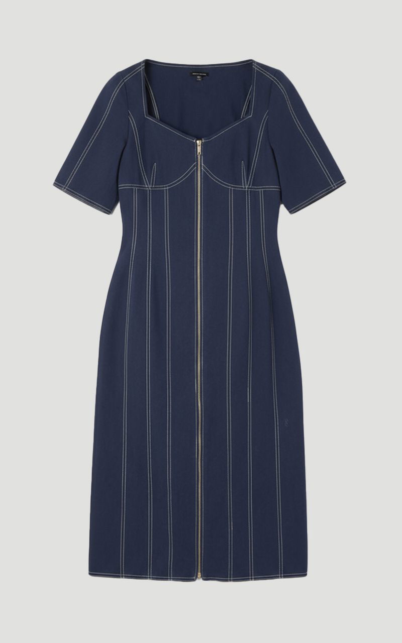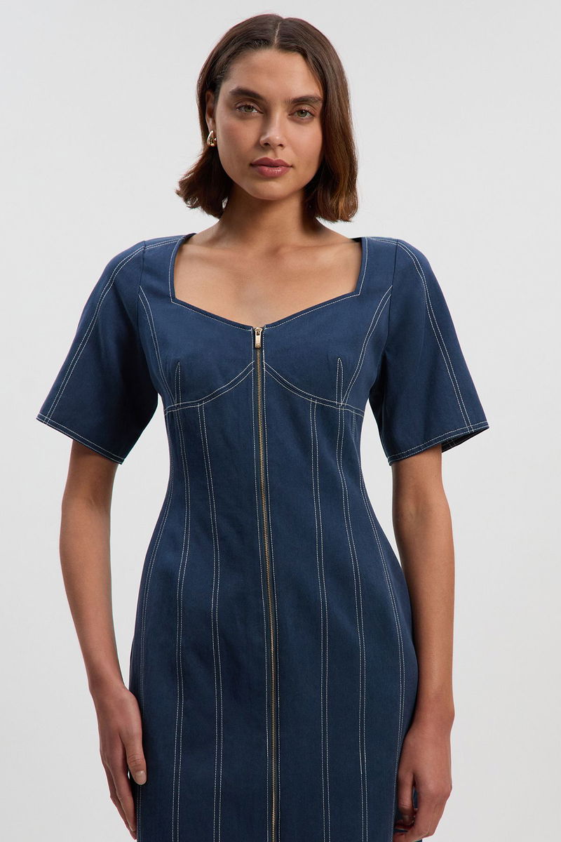 Tencel Cotton Contrast Stitch Zip Front Woven Midi Dress