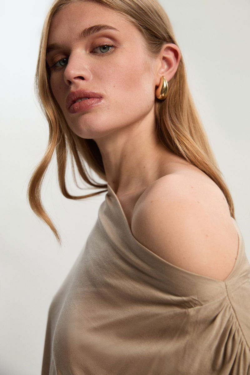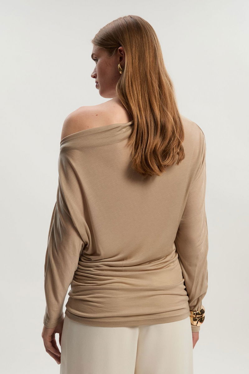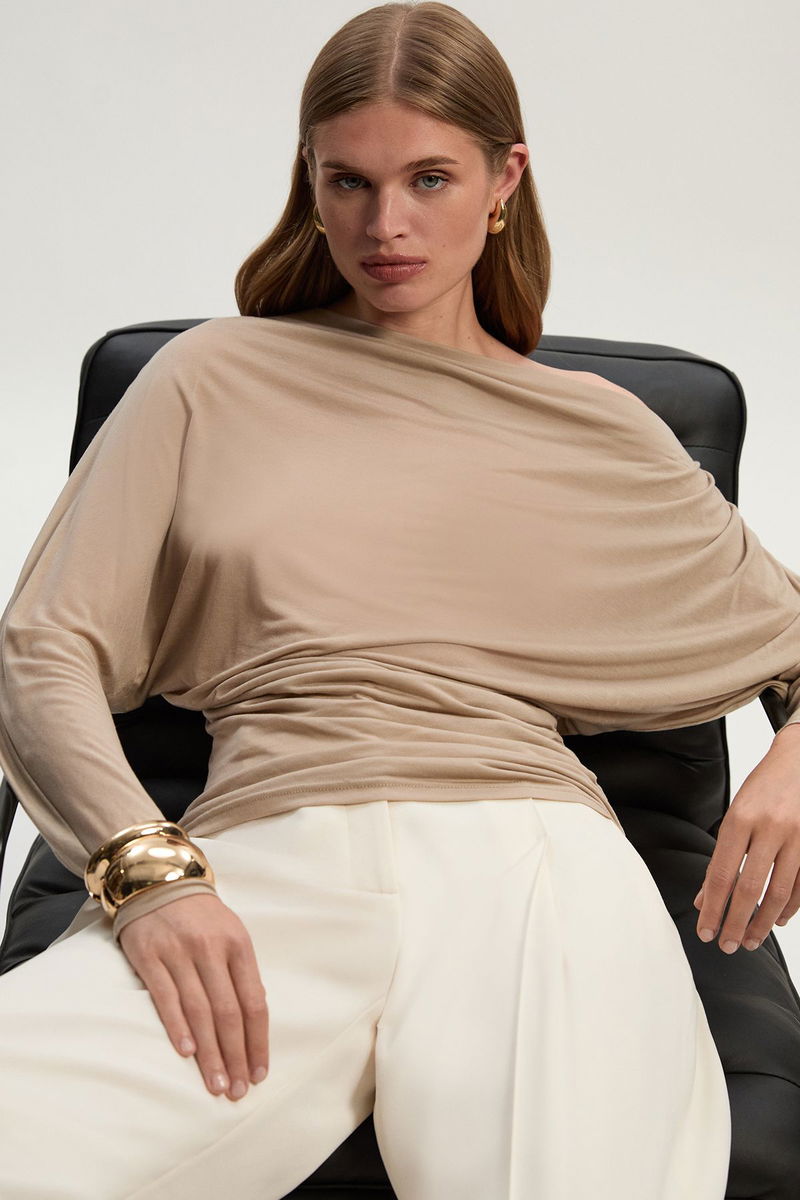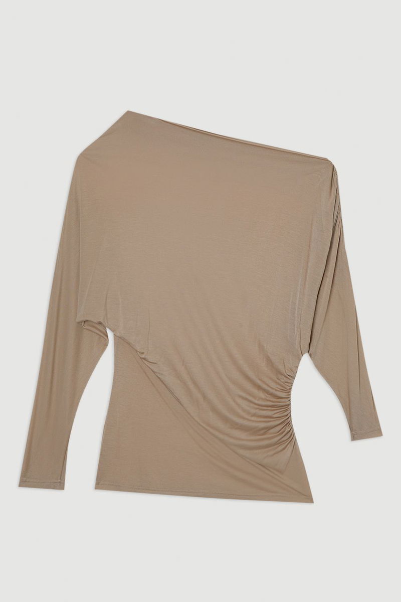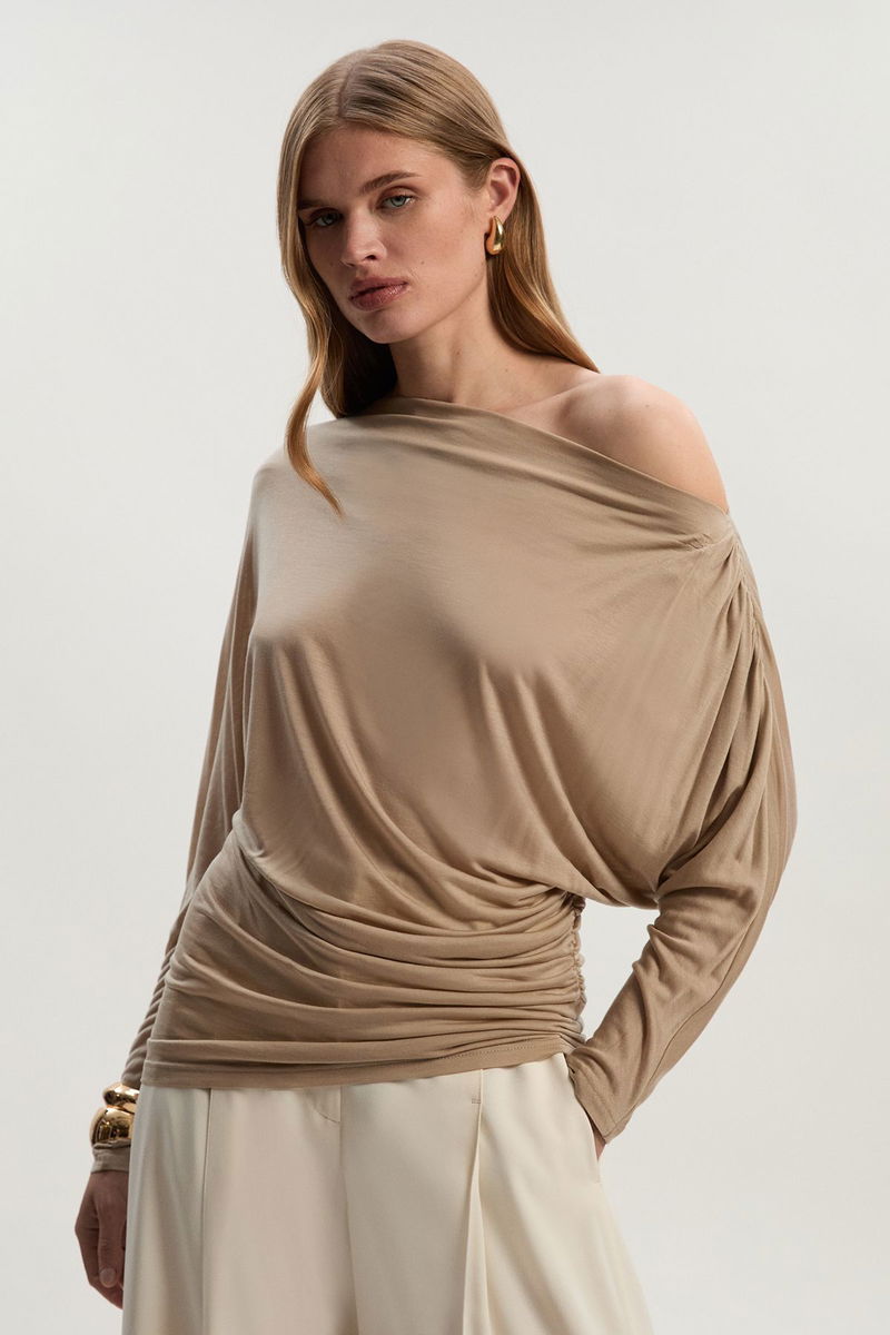 Tencel Ruched Asymmetric Neck Long Sleeve Top