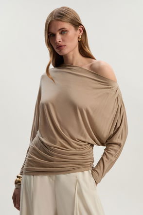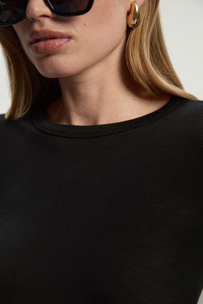 Adorned with texture among soft jersey, this long sleeve top elegantly fits the silhouette with a round neck and fitted appearance for an elevated take on staples. Pair with tailored trousers, golden accessories and barely-there heels for a timeless workwear look.