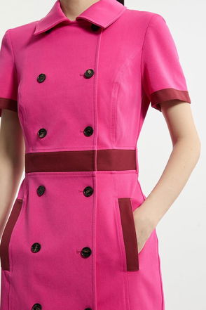 A structured, tailored fit ensures a sophisticated aesthetic, while a round neckline and side button details provide a refined finish. Crafted with signature compact stretch fabric, this midi dress promises a premium look and feel.