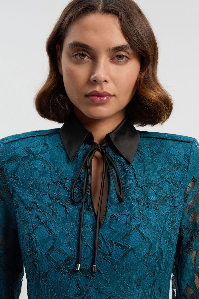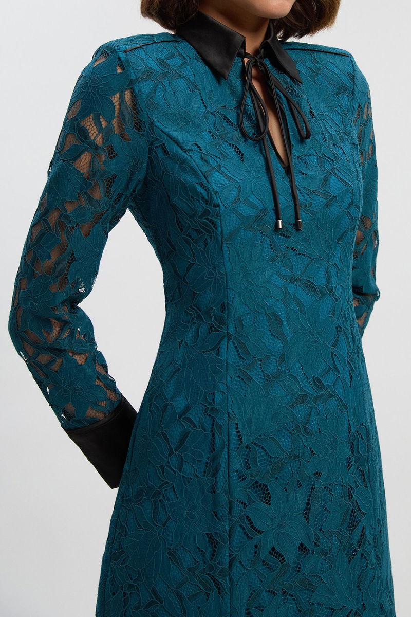 Tipped Corded Lace High Neck Detail Woven Mini Dress