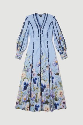 Embrace the beauty of nature with this enchanting floral maxi dress from Karen Millen. The eye-catching print and plunging neckline create a bold statement, while the lace trim adds a touch of femininity. Perfect for daytime events, this versatile piece can be styled for various occasions. Pair with flat sandals and a woven bag for a relaxed garden party look, or dress it up with wedge espadrilles and statement earrings for a chic family gathering. The flowing silhouette and gathered sleeves offer both comfort and style, making it an ideal choice for outdoor brunches or casual weekend outings. Layer with a lightweight cardigan for cooler evenings, and you'll be ready for any daytime adventure in effortless elegance.